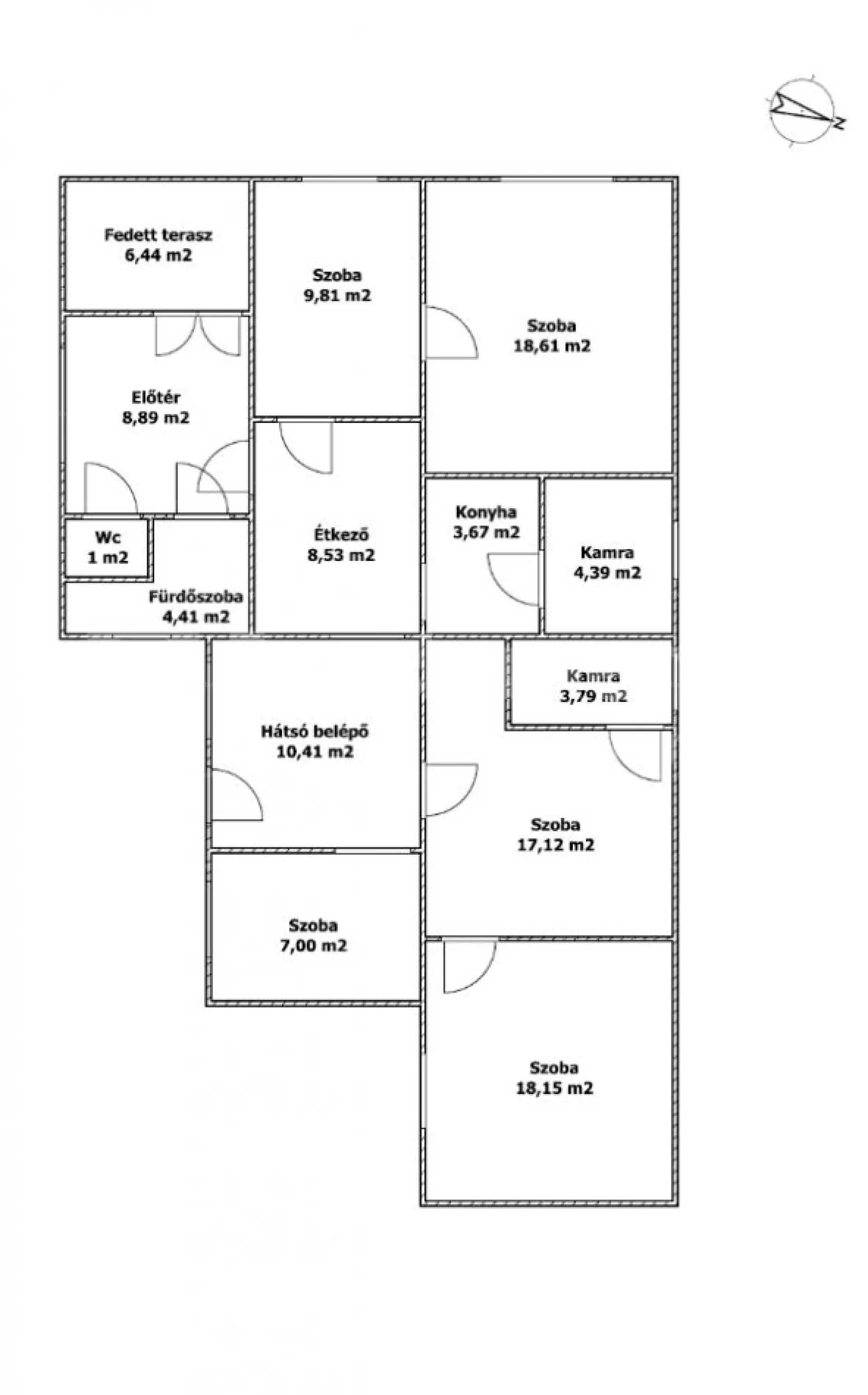Az ingatlanban fedett terasz, előtér, étkező, konyha, két kamra, fürdőszoba, külön WC, hátsó belépő és 3 egész és 2 félszoba található.