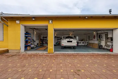 A telken egy 65 m²-es, fűtött, 3 állásos, szerelőaknás garázs vár, elektromos autótöltővel és elektromos kapuval.