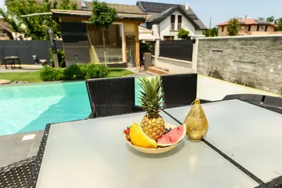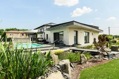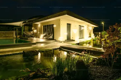 •A gondozott kertben egy 15x4 méteres, LEDVILÁGÍTÁSSAL, vízeséssel ellátott 60m2-es medence, valamint 30 méteres, öntisztuló kerti tó is helyet kapott.