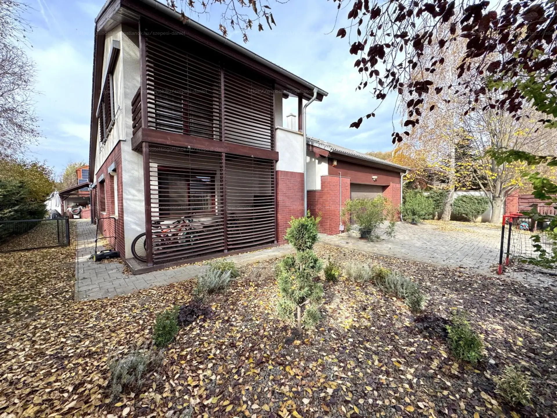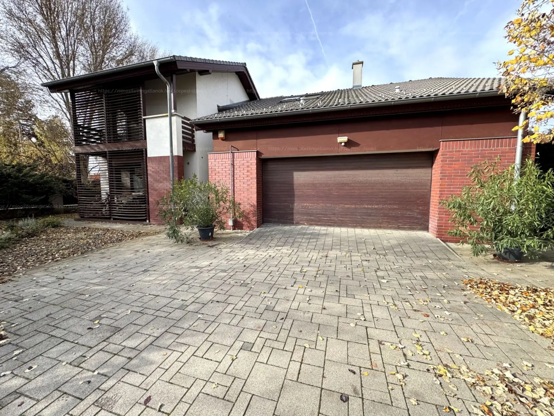 A telekre érkezve egy igényesen kialakított, térkövezett beálló fogad, amely több gépjármű számára is kényelmes parkolási lehetőséget biztosít. Innen közvetlenül megközelíthető a 48,5 m²-es, elektromos Hörmann kapuval felszerelt dupla garázs. A családi ház körbejárható, rendezett előkerttel rendelkezik. A zöld, nyugodt környezetnek és a kedvező telek adottságainak köszönhetően az utcáról teljes mértékben védett a magánszféra.