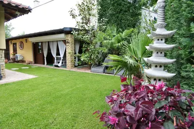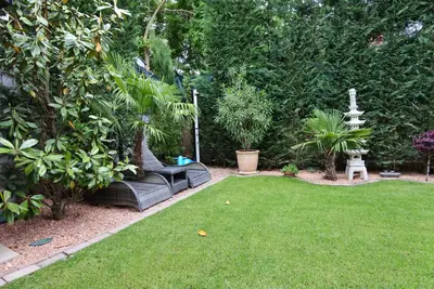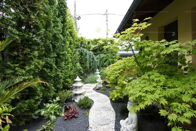A kapun belépve új világba lépünk, ahol érezhetően minden részlet gondosan, odafigyeléssel és igényesen lett kialakítva. A gyönyörűen ápoltkertben találunk két hangulatvilágítással ellátott halastavat, kerti csobogót, friss konyhafűszereknek otthont adó magas-ágyásokat, csendes meditációra, jógára kialakított japánkertet, és egy teljesen privát, elszigetelt szabadtéri jakuzzit is. A kertben lehetőség van pálmafa árnyékában napozgatni és a szauna világ kedvelői sem fognak csalódni.