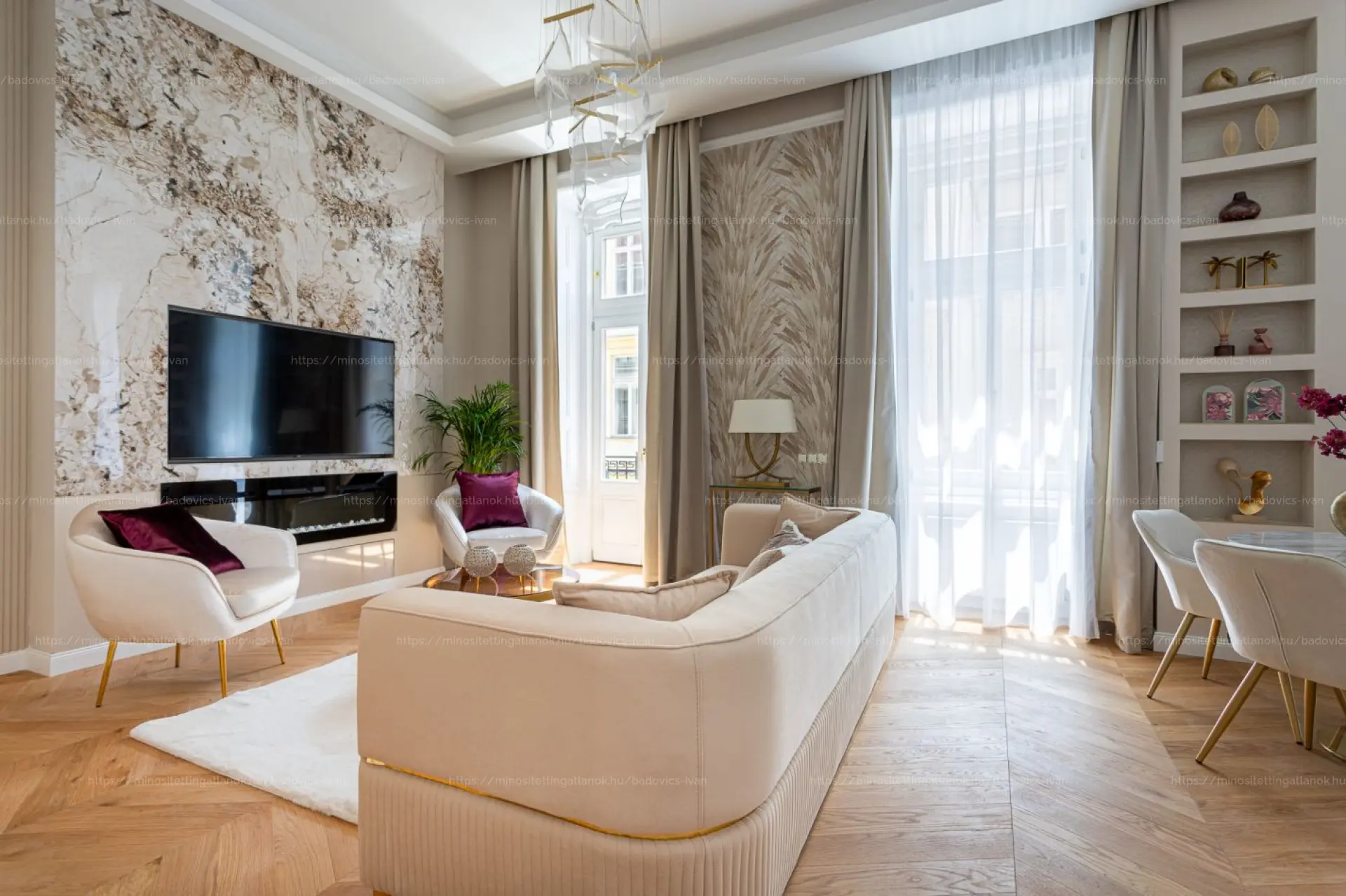 ERKÉLYES LUXUSLAKÁS AZ V. KERÜLETBEN, A BAZILIKA KÖZELÉBEN, GYÖNYÖRŰ ÉPÜLETBEN!V. kerületben, a Bazilika és Duna-part közötti részen eladó egy TELJESKÖRŰEN FELÚJÍTOTT, 80 m2-es, amerikai konyhás nappali + 2 hálószobás, duplakomfortos, ERKÉLYES, klimatizált LUXUSLAKÁS egy nagyon szép, LIFTES, Hild József által tervezett társasház 2. emeletén.A nappali és a nagyobbik hálószoba ablakai a csendes Mérleg utcára néznek, míg a kisebbik a nyugodt belső udvarra. Mindkét hálószobához külön fürdőszoba és gardrób tartozik.Az ingatlan kényelmét három légkondicionáló és automata sötétítők biztosítják. Fűtése házközponti, melynek a díját a közös költség tartalmazza.A konyha teljesen gépesített AEG konyhagépekkel felszerelt.A teljesen berendezés, bútorzat a vételár részét képzi.A ház műemlék, az elővásárlási procedúra végeztével azonnal birtokba vehető!