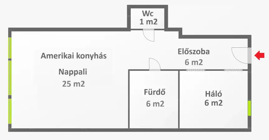 - Alapterület: 47 nm; amerikai konyhás nappali + hálószoba.