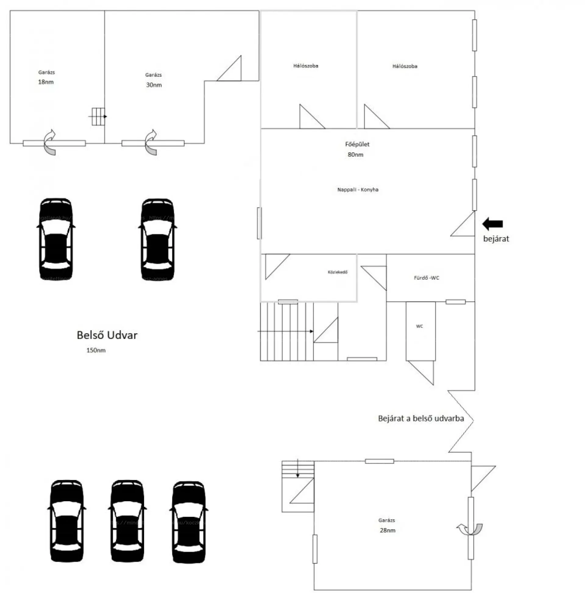 Megközelíthető az átrium üzletház felől. Az utcafronti épület (80nm), tartalmaz tágas nappalit amiből két nagy méretű szoba nyílik. Nagy méretű közlekedőt egy kisebb helységgel, valamint három garázst (melyek együttes alapterülete 76nm) és egy 180 négyzetméteres belső udvart mely legalább 3 autó tárolására alkalmas.
