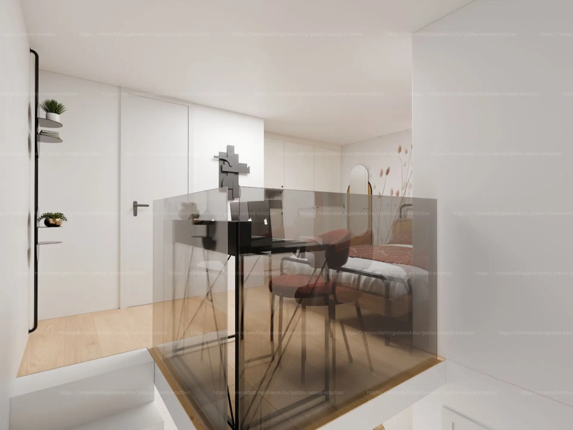 A hasznos területe 26 nm, teljes értékű belső kétszintes lakás, lent 230 cm, fent 200 cm-rel.