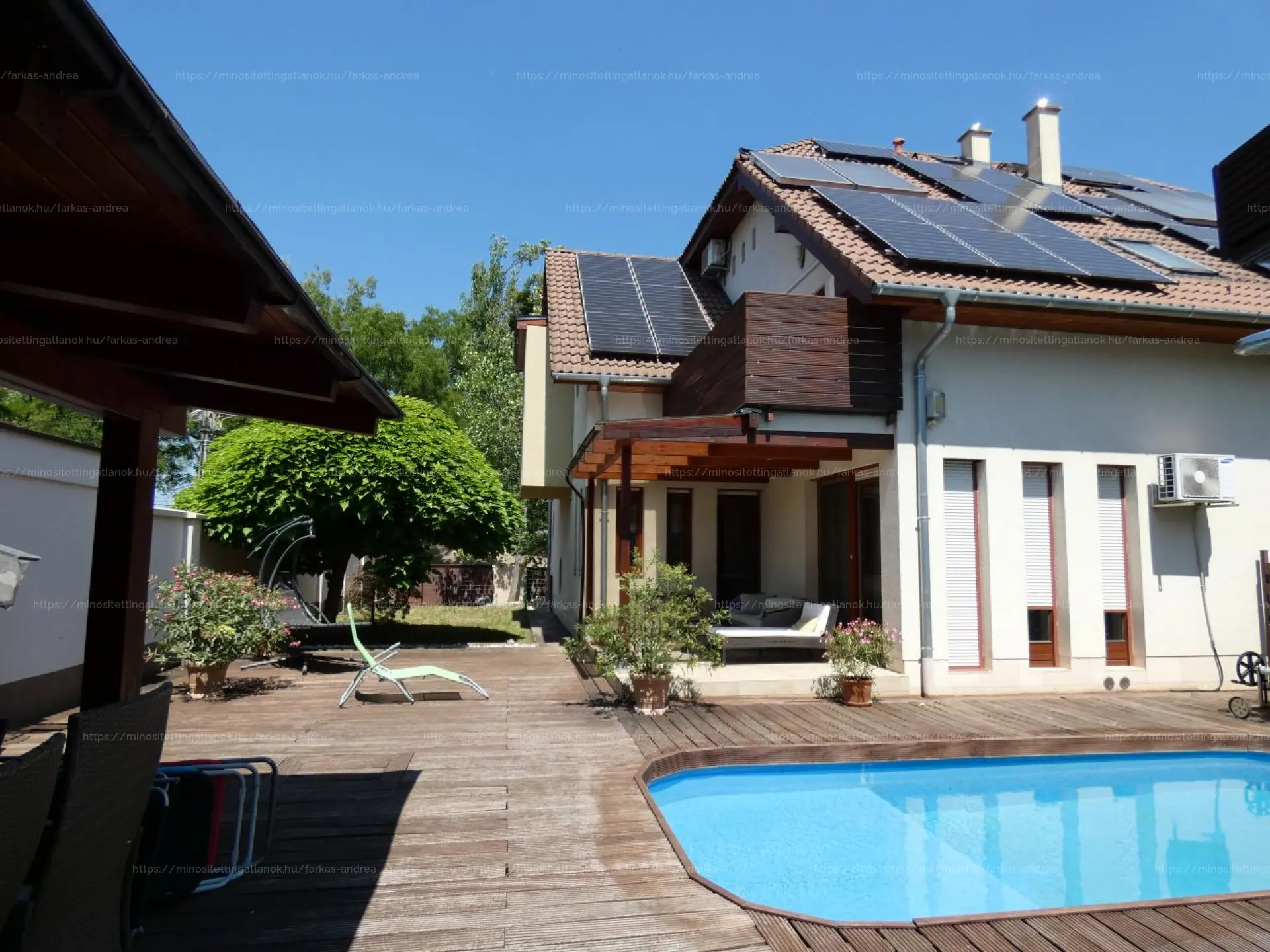 A 440 m²-es, rendezett kert valódi ékszerdoboz: a vízforgatós, épített medence ideális kikapcsolódást nyújt a nyári hónapokban, a gyerekek pedig biztonságos környezetben játszhatnak, miközben a szülők a teraszról figyelhetik őket. Nyári estéken akár a kerti szaletliban készülhet a vacsora.