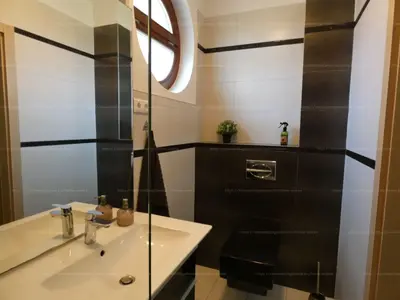 A 440 m²-es, rendezett kert valódi ékszerdoboz: a vízforgatós, épített medence ideális kikapcsolódást nyújt a nyári hónapokban, a gyerekek pedig biztonságos környezetben játszhatnak, miközben a szülők a teraszról figyelhetik őket. Nyári estéken akár a kerti szaletliban készülhet a vacsora.