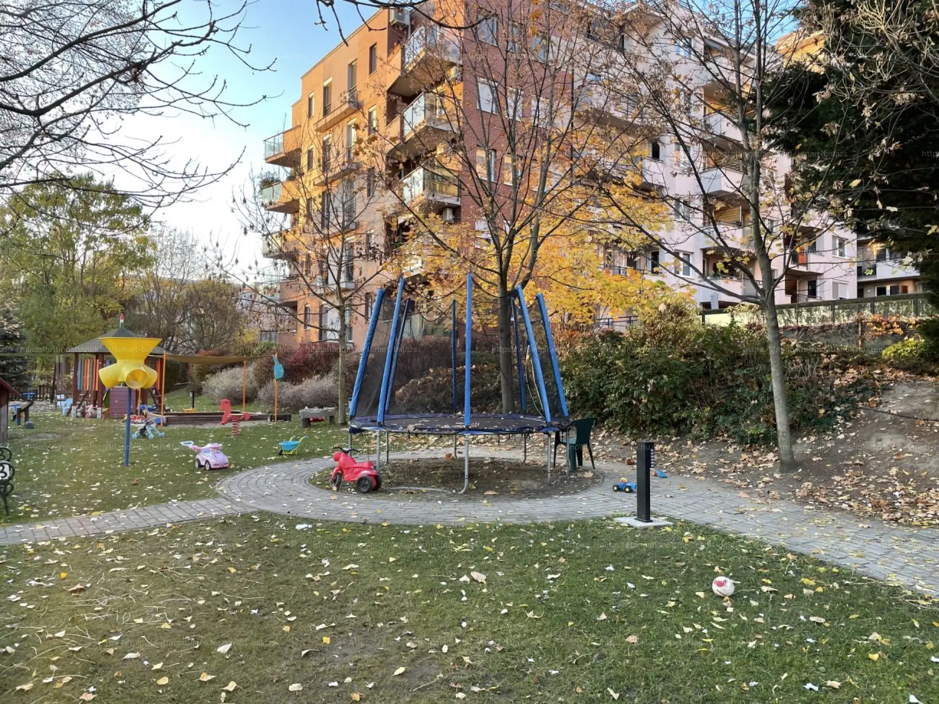 - Zöld belső udvar, játszótér, padok, kerti sütögető