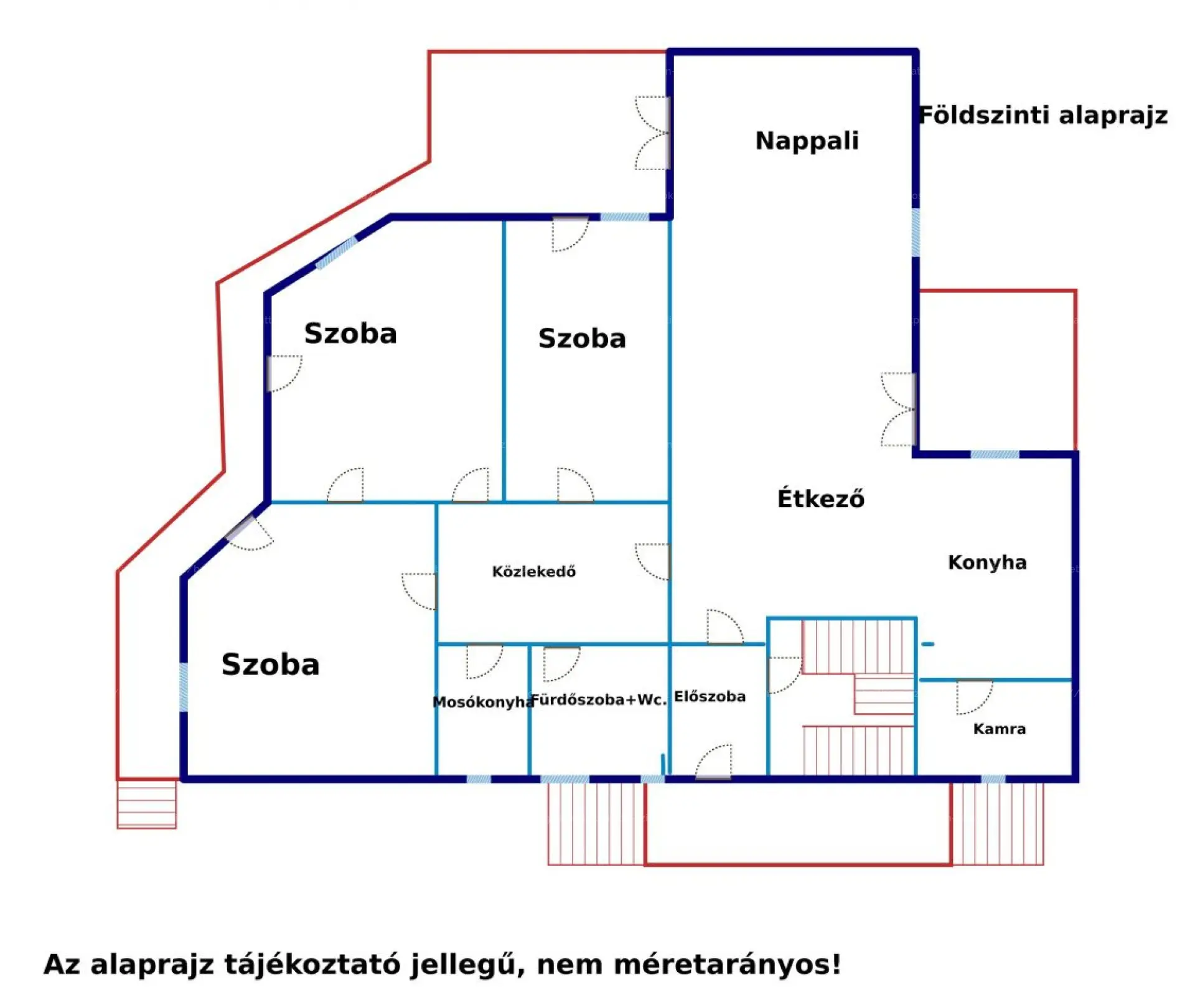 - előszoba+lépcsőház, szinteltolásos nappali étkezővel, konyha+kamra, külön közlekedő a szobákhoz, 3 szoba,fürdő-Wc-vel, mosókonyha/gardrób, külön Wc,