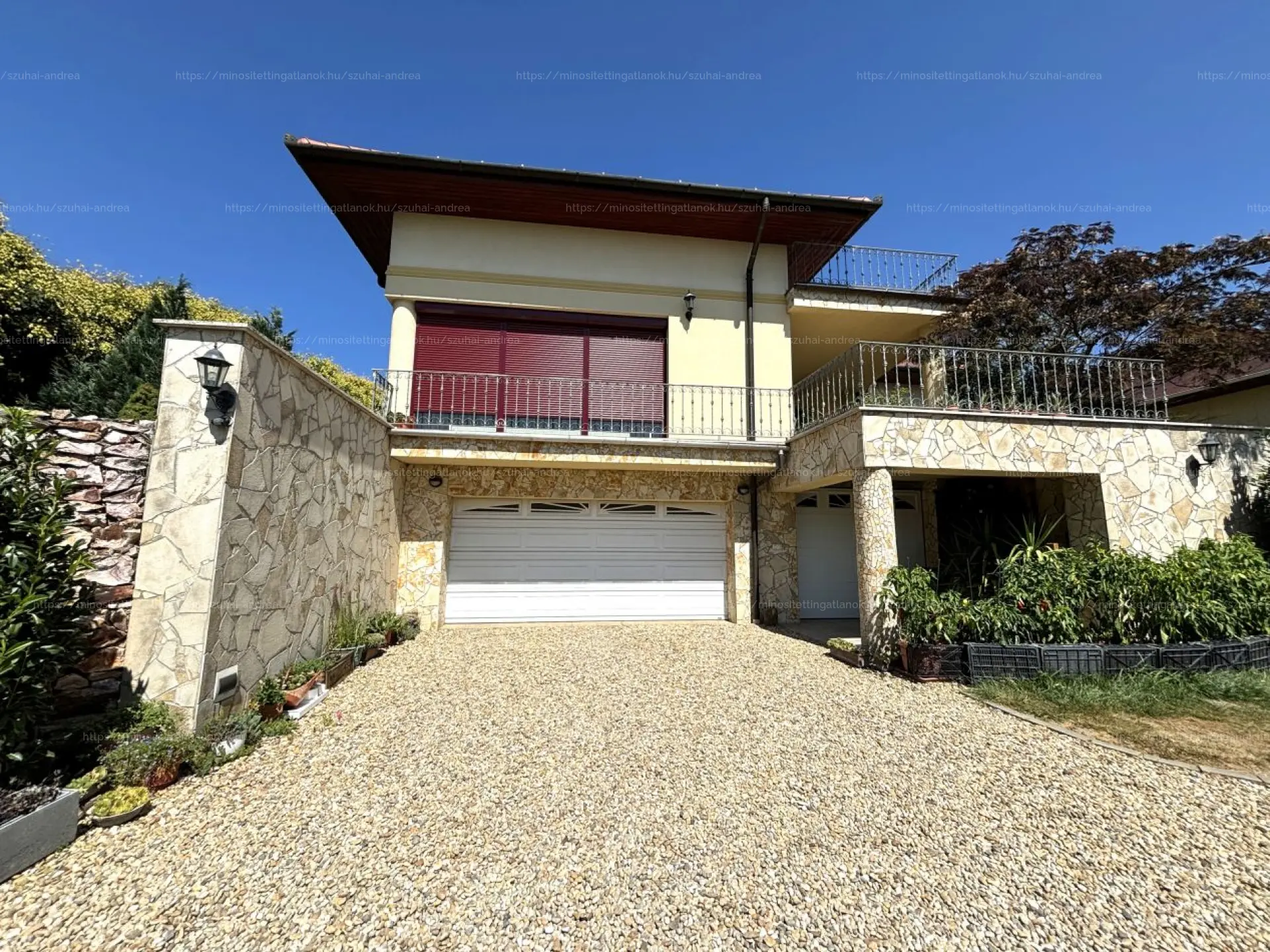 • A parkosított térkövezett kert fúrt kúttal ellátott. A parkolás dupla elektromos kapun keresztül a garázsban megoldott.