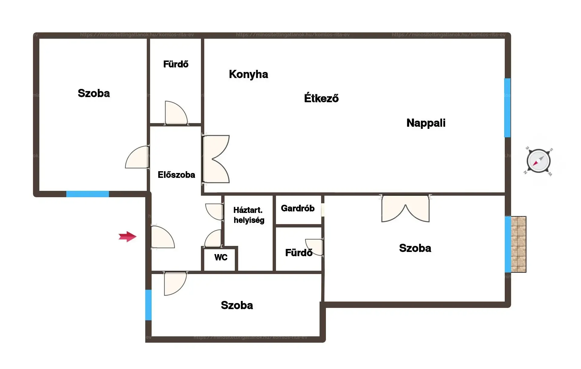 Az 53 nm-es amerikai konyhás nappali mellet a többi helyiség is rendkívül tágas, kényelmes, praktikusan kialakított. 3 hálószoba, 2 fürdőszoba, egy kézmosóval ellátott toalett, gardrób, háztartási helyiség és előszoba áll rendelkezésünkre.
