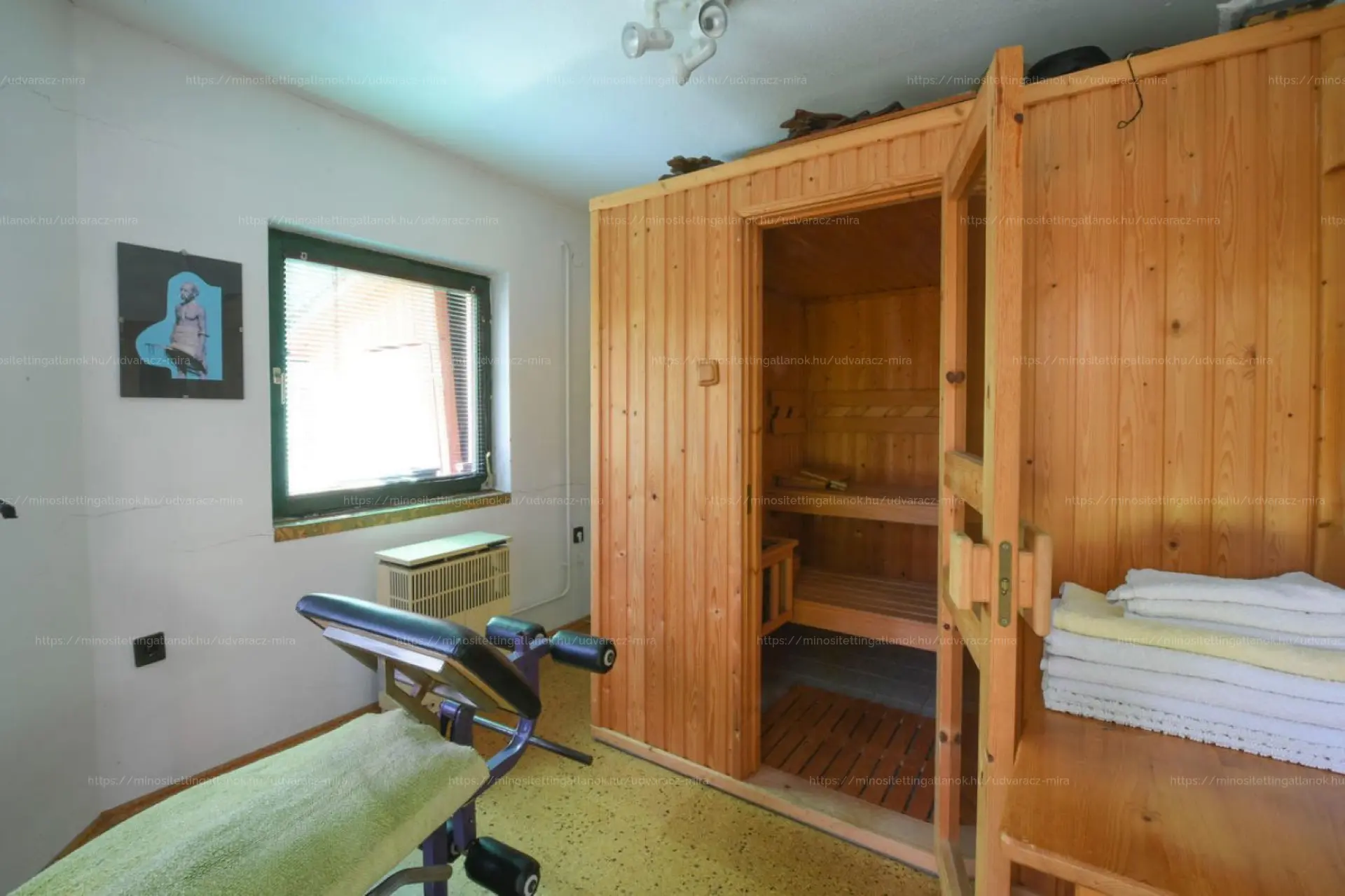 Kis ház (58 m2): előszoba, nappali, konyha, fürdőszoba, kondiszoba–szauna, szerszámos. Igazi kincs ez a házikó. Itt lehetőség van elvonulni, akár home officera, hobbi tevékenységre vagy családtagok, vendégek elszállásolására.