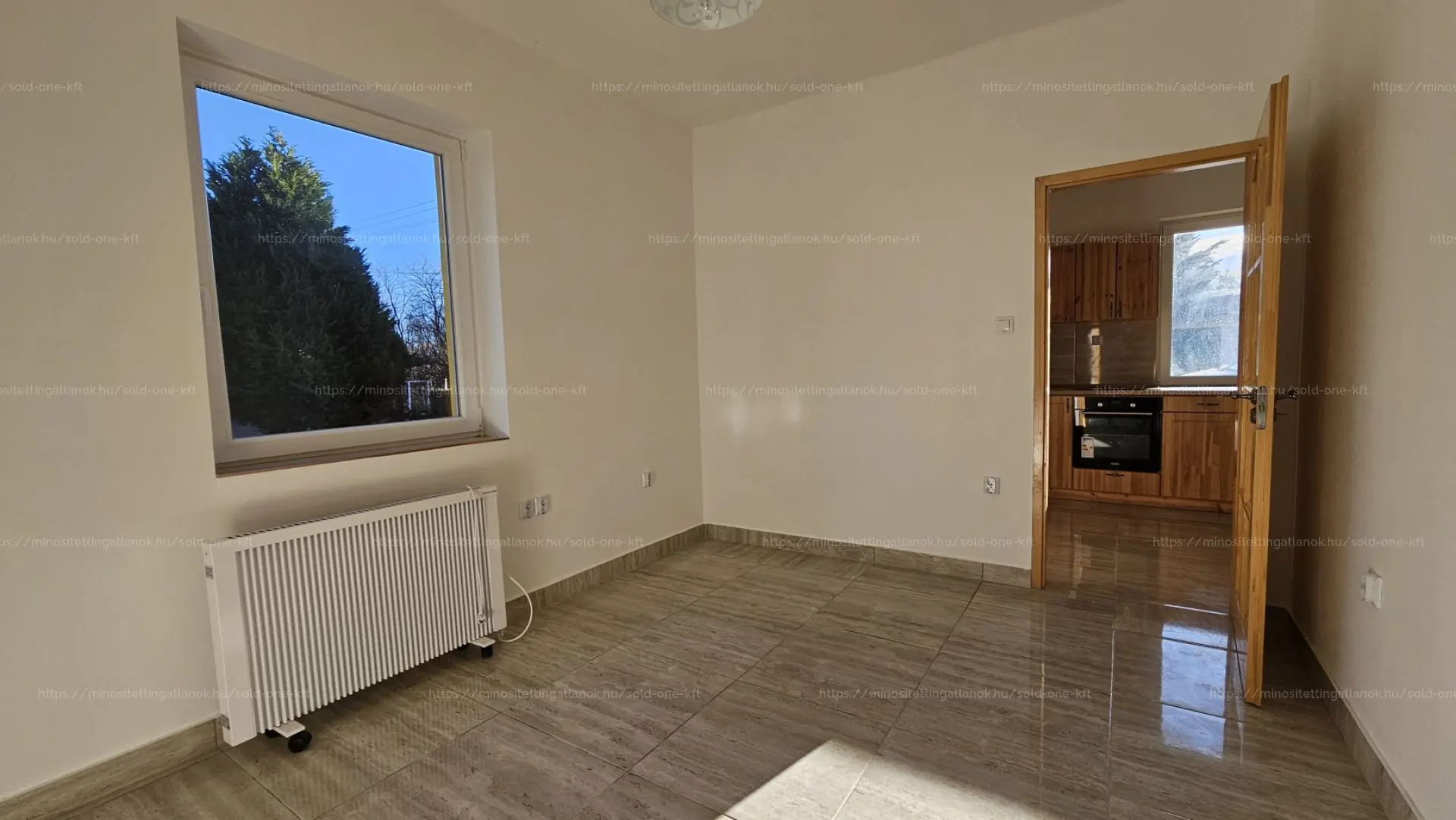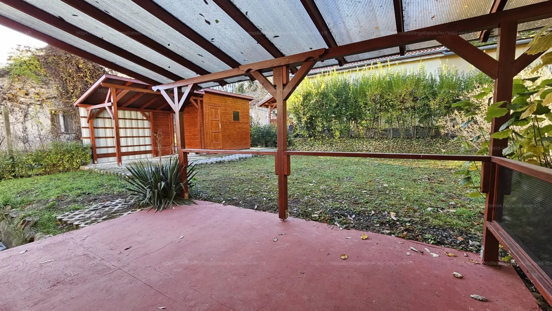 Az ingatlan elosztása praktikus: két szoba, étkezős konyha, közlekedő, kamra és fürdőszoba alkotja. A nappaliból egy 14 m²-es fedett teraszra léphetünk ki, amely a mindennapok nyugodt pihenőhelye lehet. A házhoz 65 m² kizárólagos kertrész tartozik, amelyben szerszámoskamra és fatároló is található.