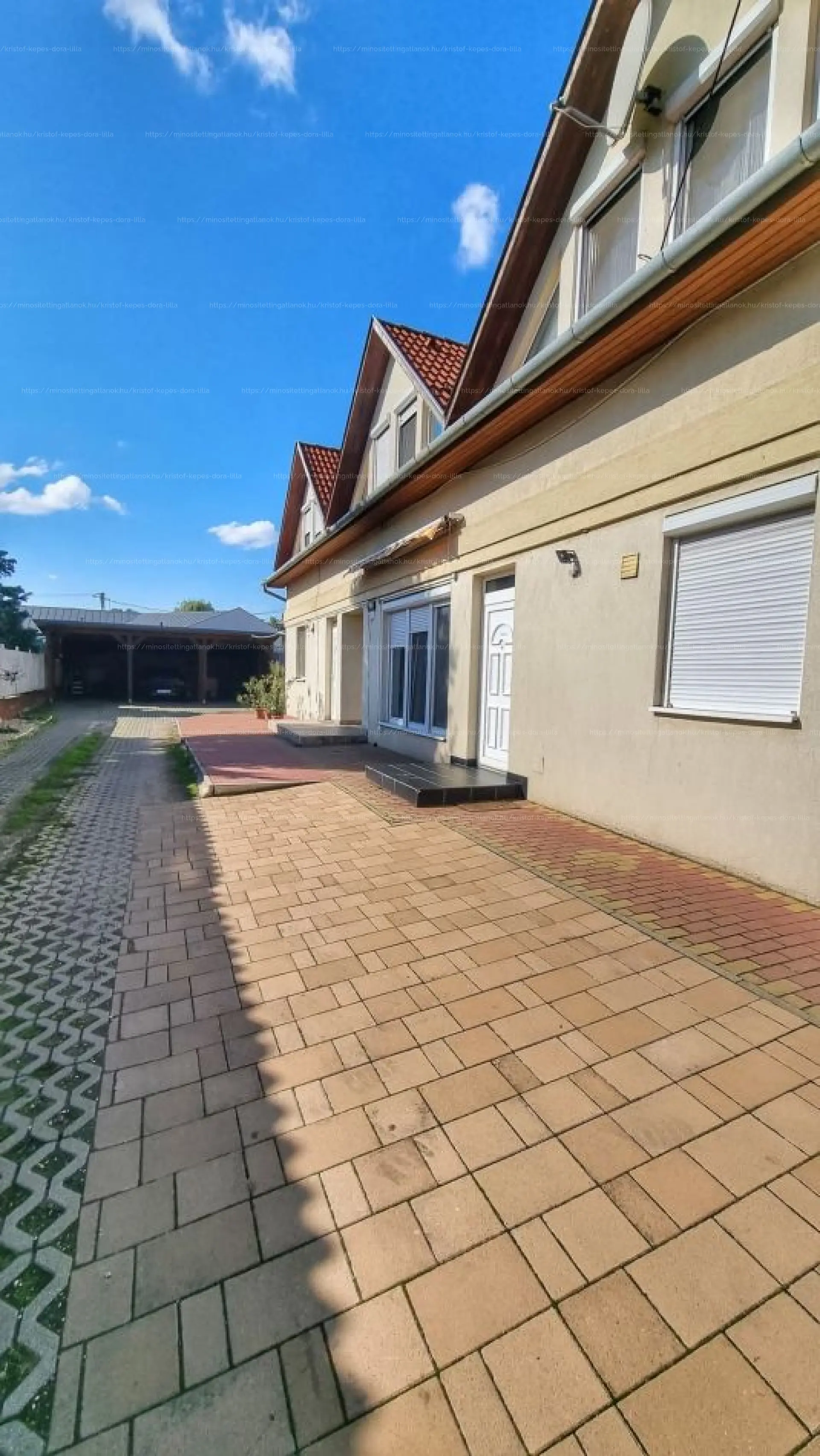 Az elektromos kapuval ellátott, rendezett térkövezett udvarról nyílik a saját nyitott garázs és a plusz kocsibeálló, amelyek 2024-ben a kerítéssel és a kapuval együtt felújításra kerültek. A közös udvar rendezett, igényes kialakítású.