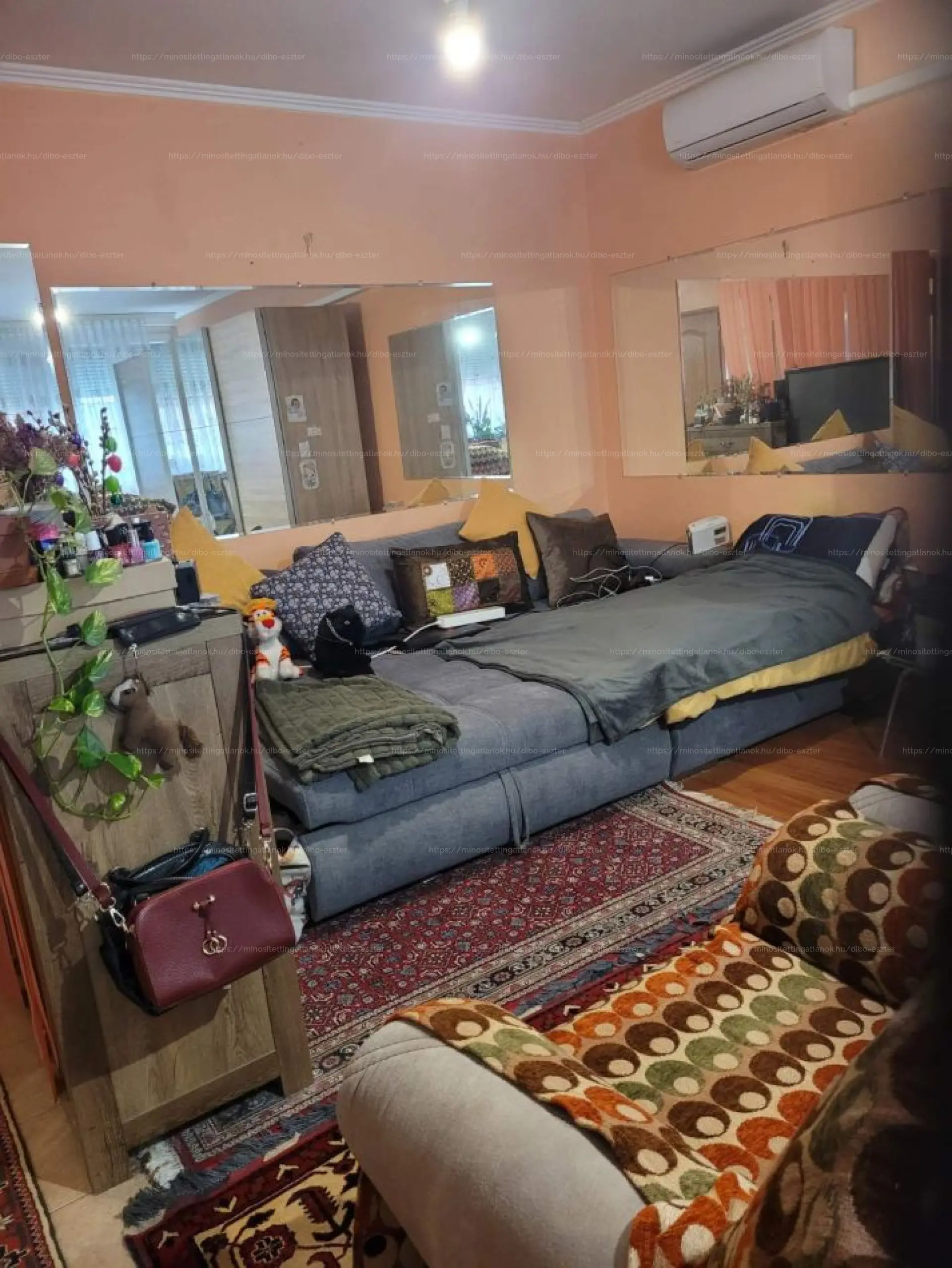 A szobában lévő nagy tolóajtós szekrény a lakásban marad, a vételár részét képezi. A nyári kellemes hőmérsékletet redőnyök és klíma segíti.