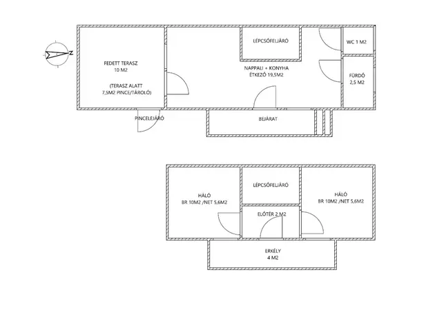 emelet: 2db br 10/nettó 5,6 m2 hálószoba; közlekedő 2m2; erkély 4m2