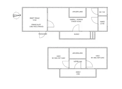 fölszint: 19,5m2 nappali + étkező + konyha; 2,5m2 fürdő; 1m2 wc; 10m2 fedett terasz