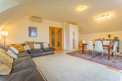 A 102m2-es lakás egy 2000-es évek elején épült háromlakasos társasház legfelső emeletén helyezkedik el, teljes békét és nyugalmat biztosítva tulajdonosának.