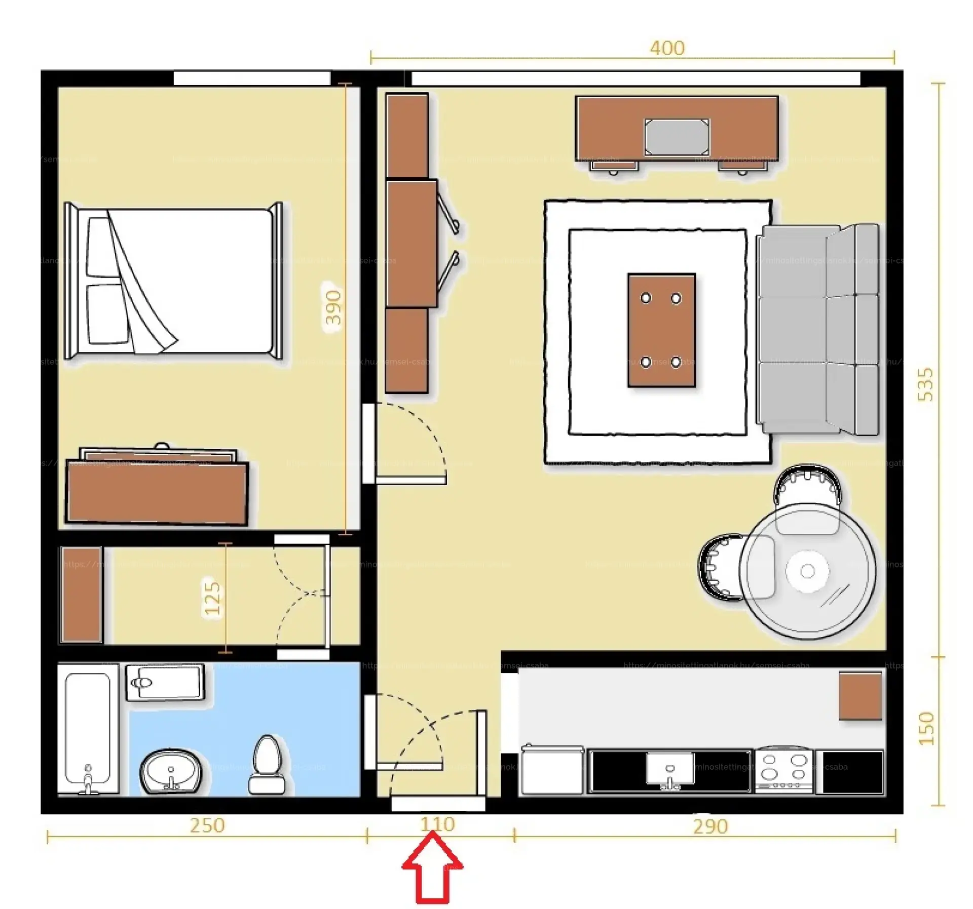 Az ingatlan kényelmes elosztású, külön is megközelíthető szobák vannak benne, a kisebb szobából pedig nyílik egy gardróbhelyiség. Zuhanyzós fürdőszoba és előszoba is helyet kapott a lakásban.