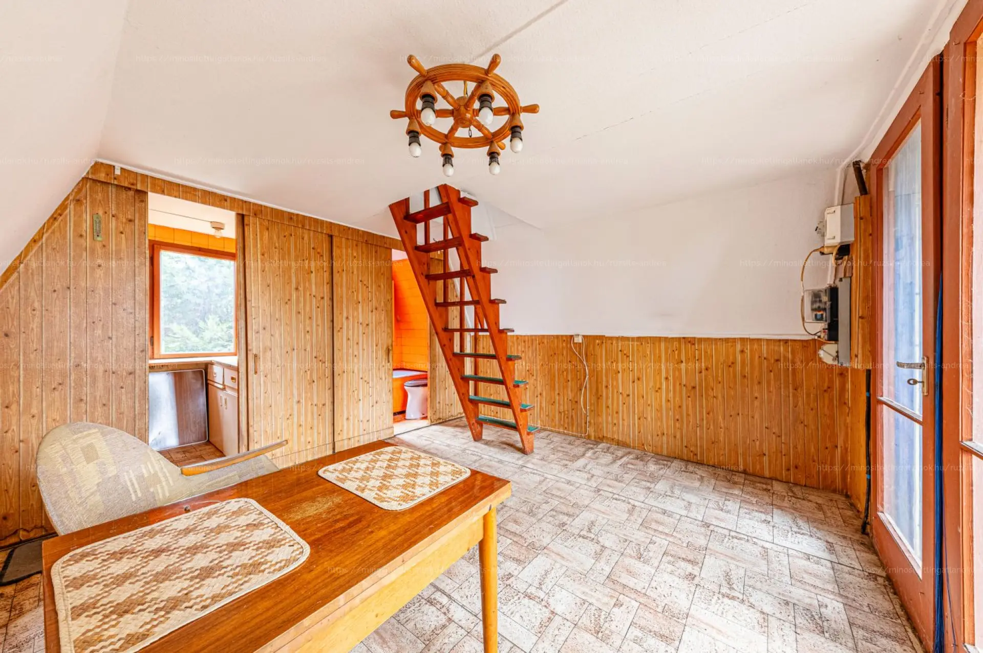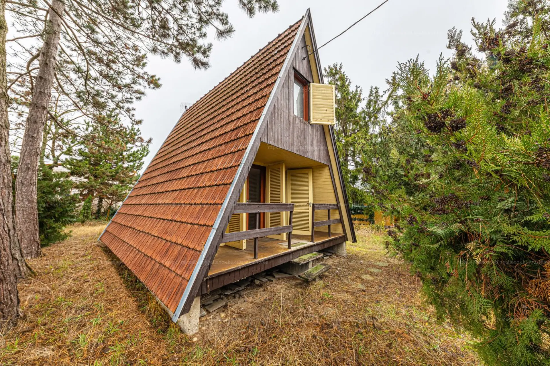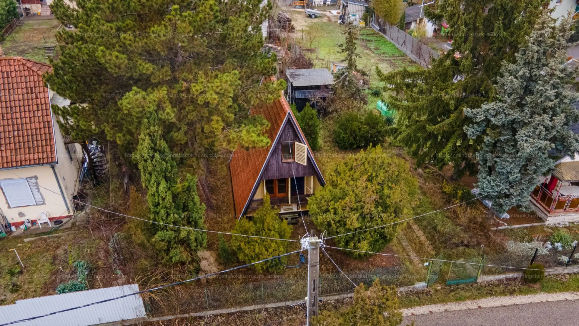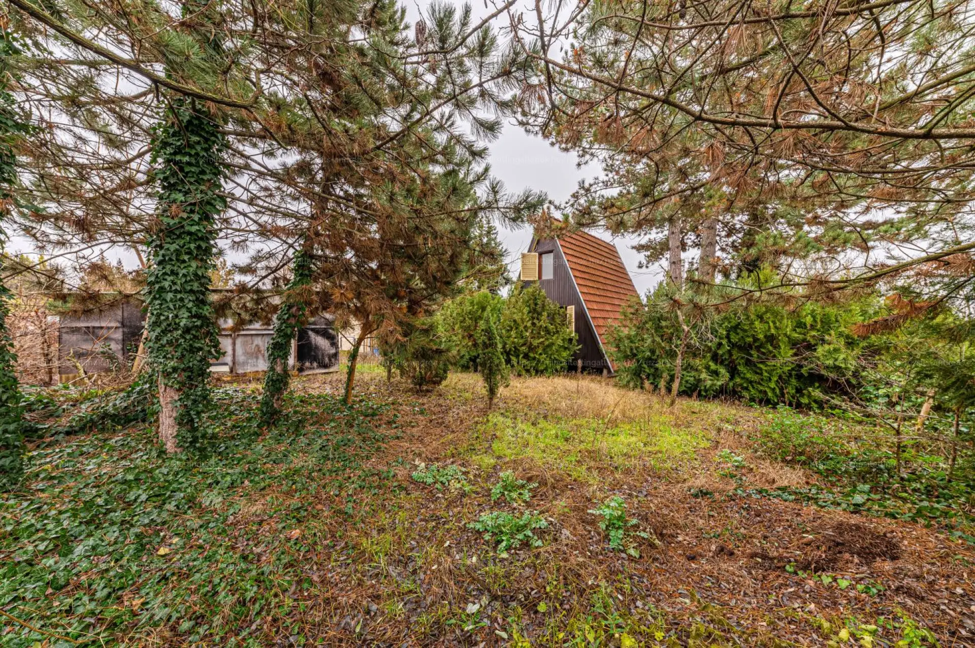 A telken található egy könnyűszerkezetes hétvégi ház: alapterület 21 nm, bruttó lakóterület 33 nm. Földszint: 12 nm-es szoba, konyha, fürdőszoba WC-vel. Tetőtér: két hálófülke beépített szekrényekkel és ágyakkal. KÖZMŰVEK: vezetékes víz, csatorna és villany BEVEZETVE; GÁZ AZ UTCÁBAN. Fűtés elektromosan megoldható, a meleg vizet VILLANYBOJLER biztosítja. A melléképület tárolásra vagy GARÁZSNAK használható.