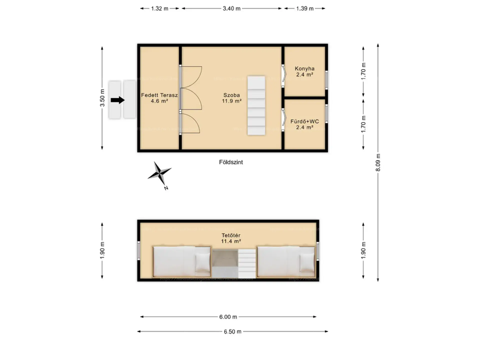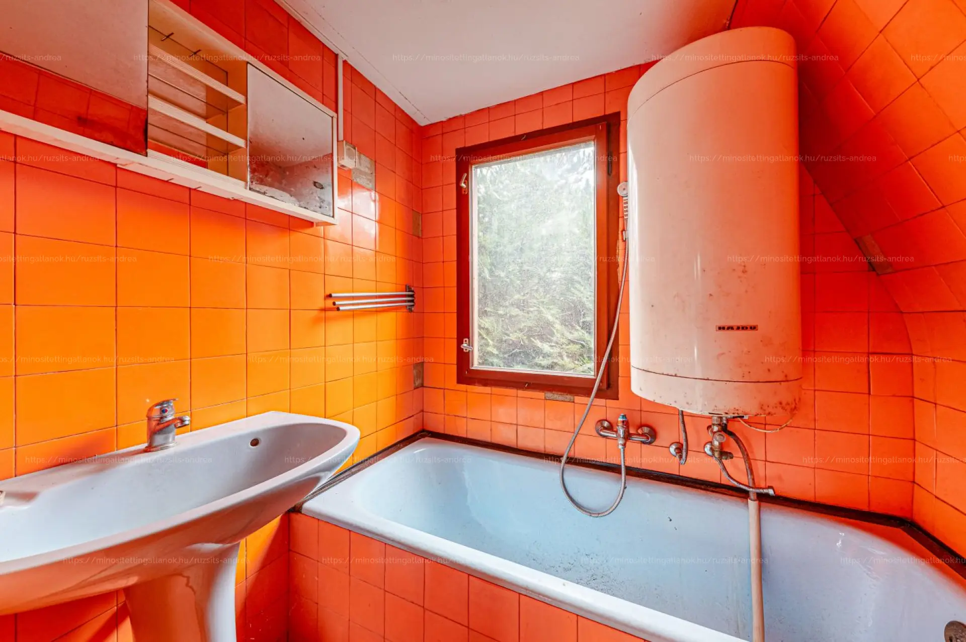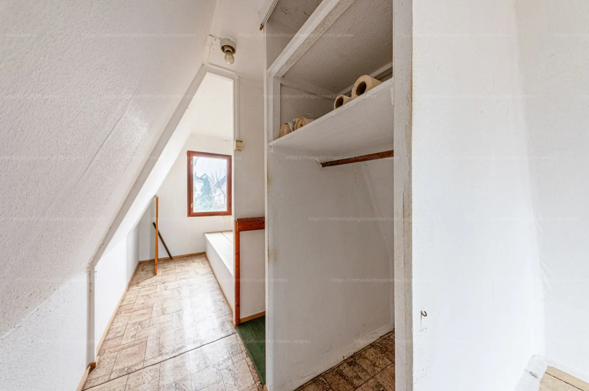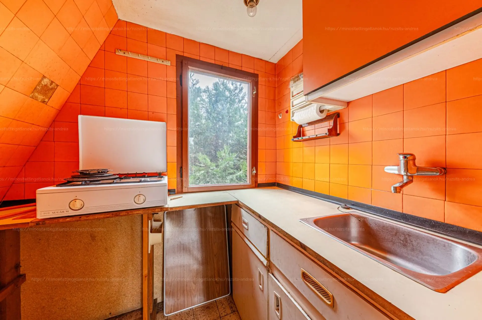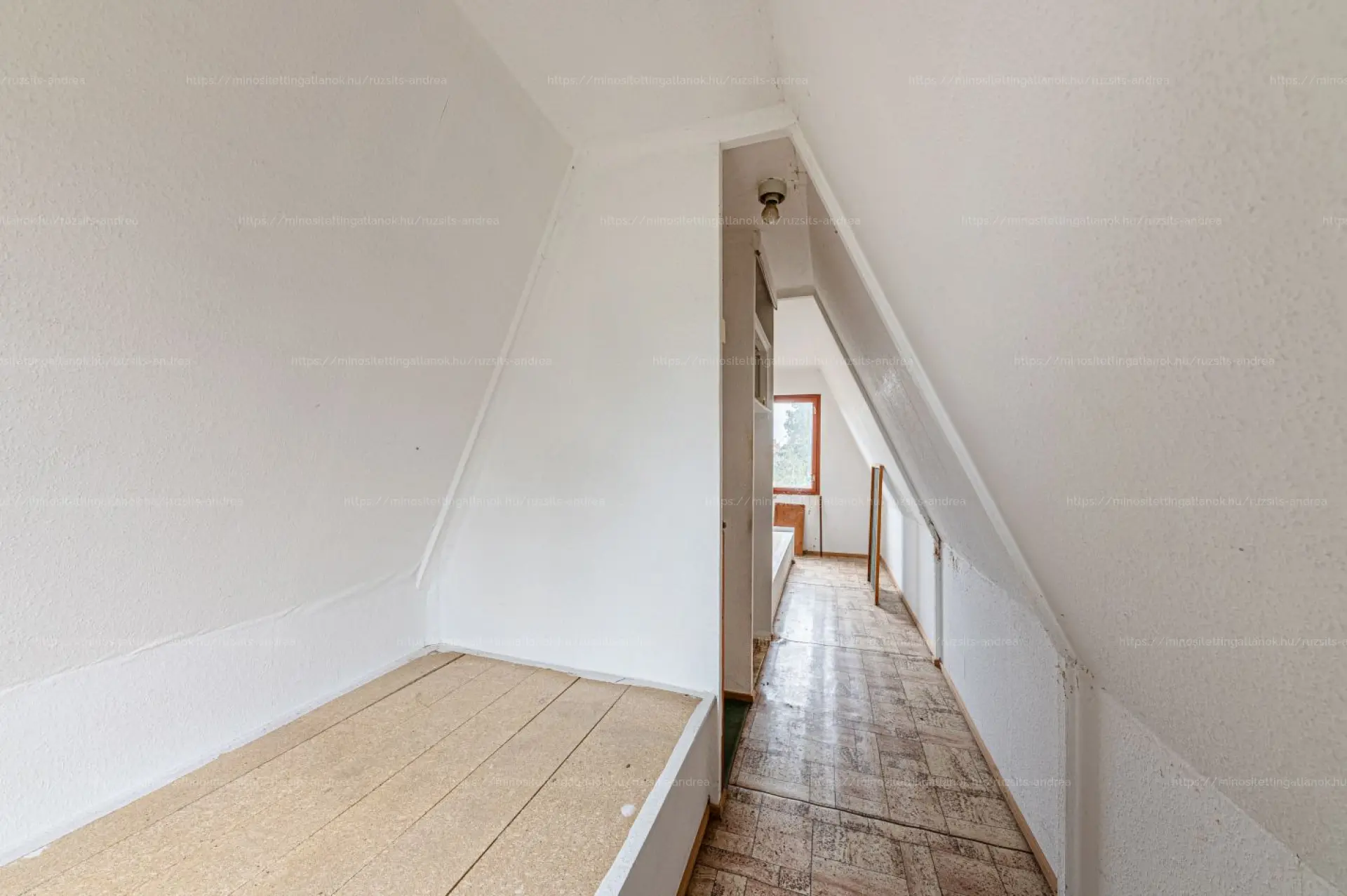 A telken található egy könnyűszerkezetes hétvégi ház: alapterület 21 nm, bruttó lakóterület 33 nm. Földszint: 12 nm-es szoba, konyha, fürdőszoba WC-vel. Tetőtér: két hálófülke beépített szekrényekkel és ágyakkal. KÖZMŰVEK: vezetékes víz, csatorna és villany BEVEZETVE; GÁZ AZ UTCÁBAN. Fűtés elektromosan megoldható, a meleg vizet VILLANYBOJLER biztosítja. A melléképület tárolásra vagy GARÁZSNAK használható.