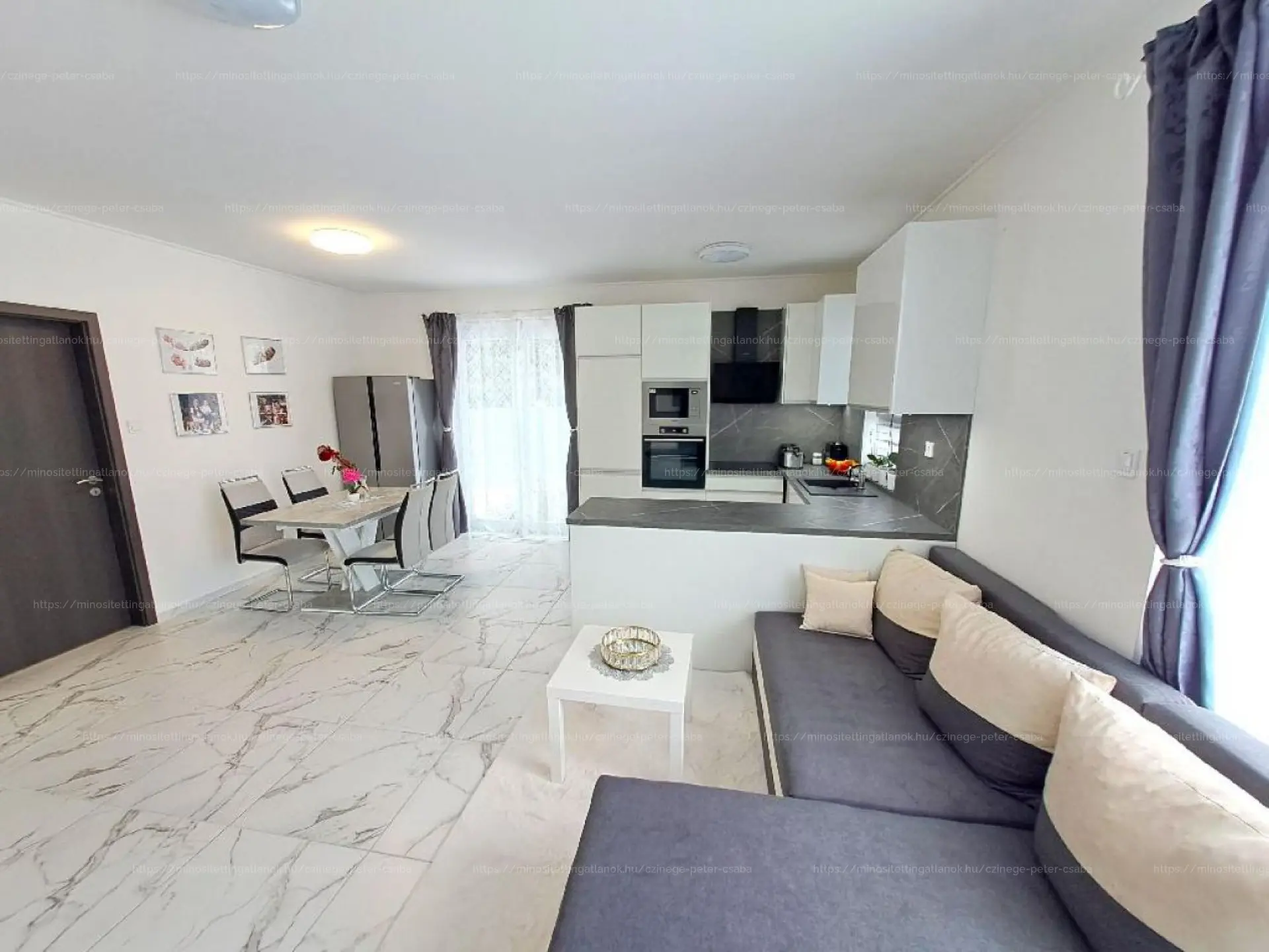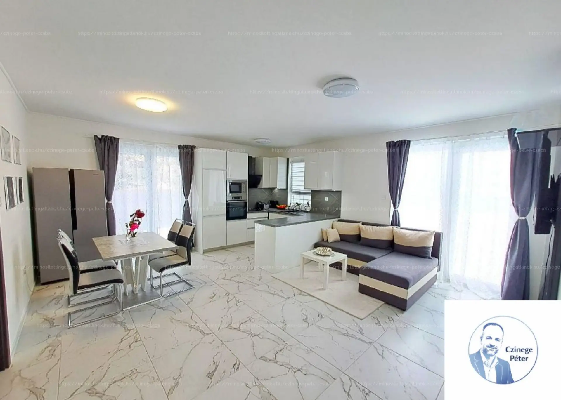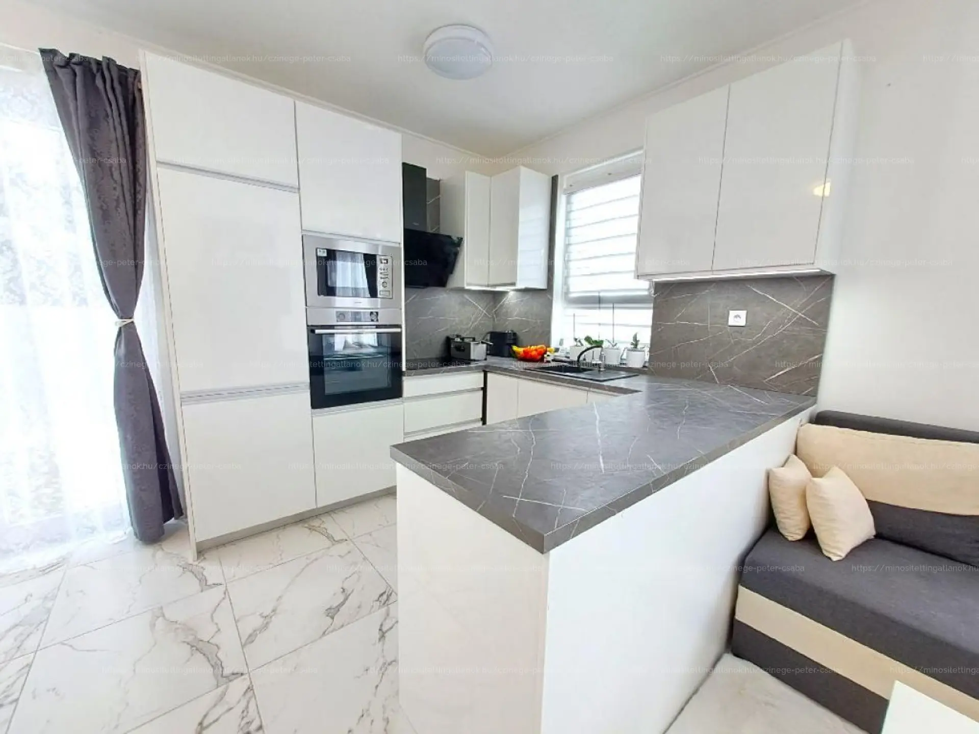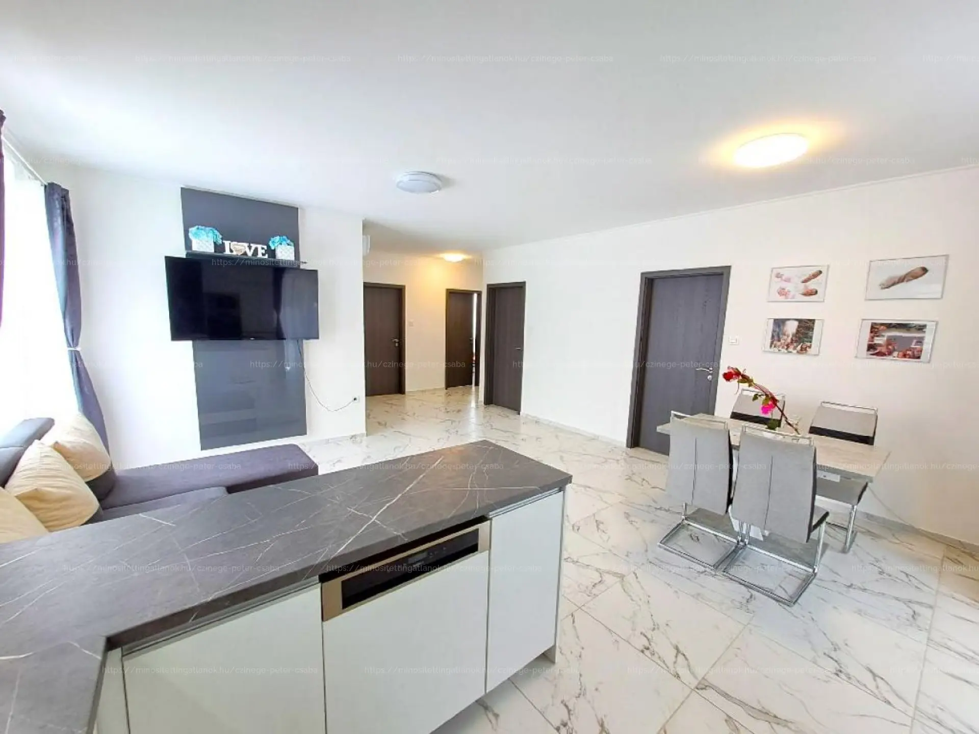 VÉTELÁR RÉSZE: A 2024-es, garanciális beépített konyhagépek (sütő, mikro, főzőlap,mosogatógép, páraelszívó), a TV-fal, és az igényes lámpák és szaniterek.