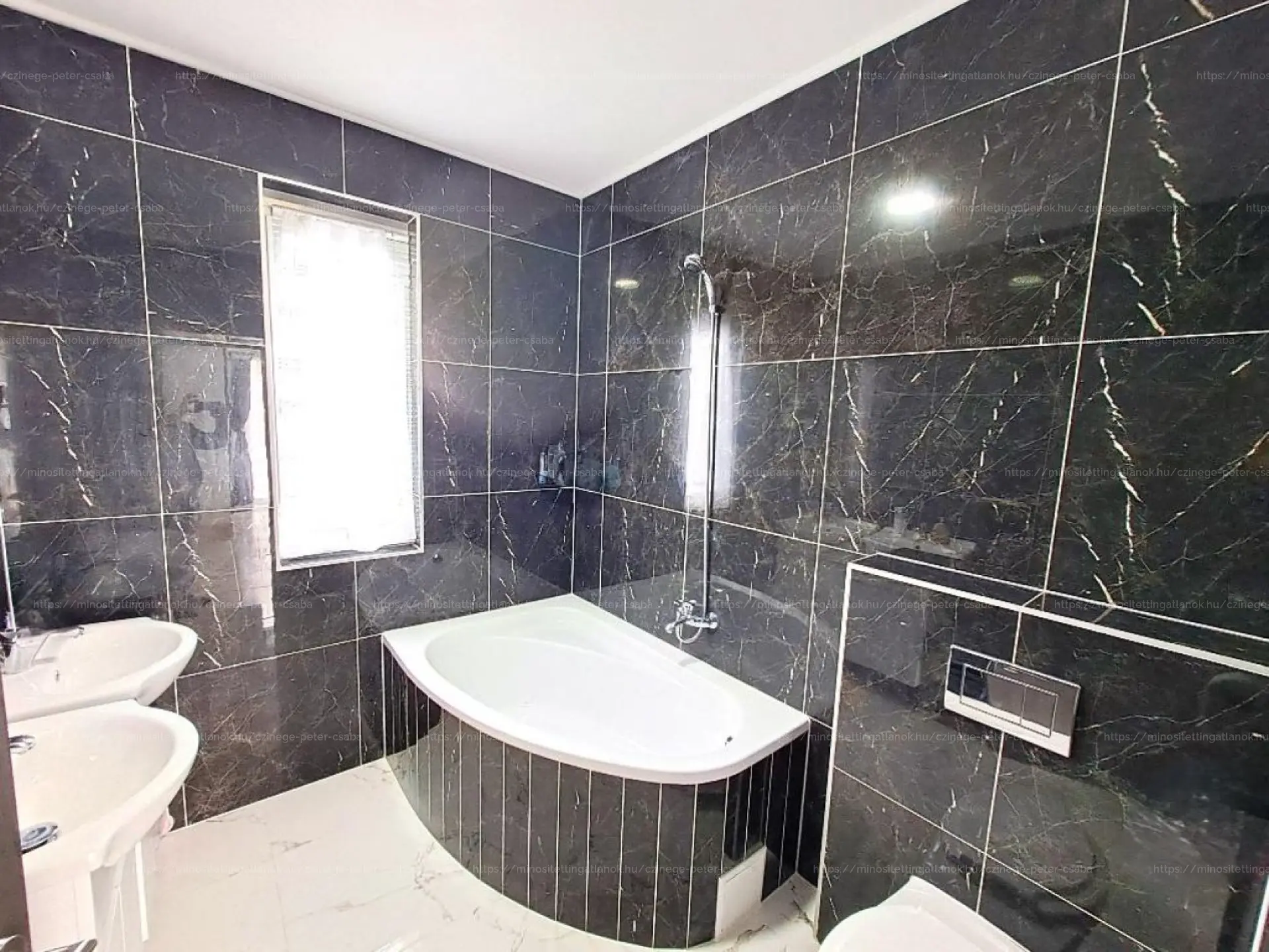 FÜRDŐSZOBA: Dupla mosdó a gyorsabb reggeli készülődésre , sarokkád, WC és igényes szaniterek, minimalista stílusú design.
