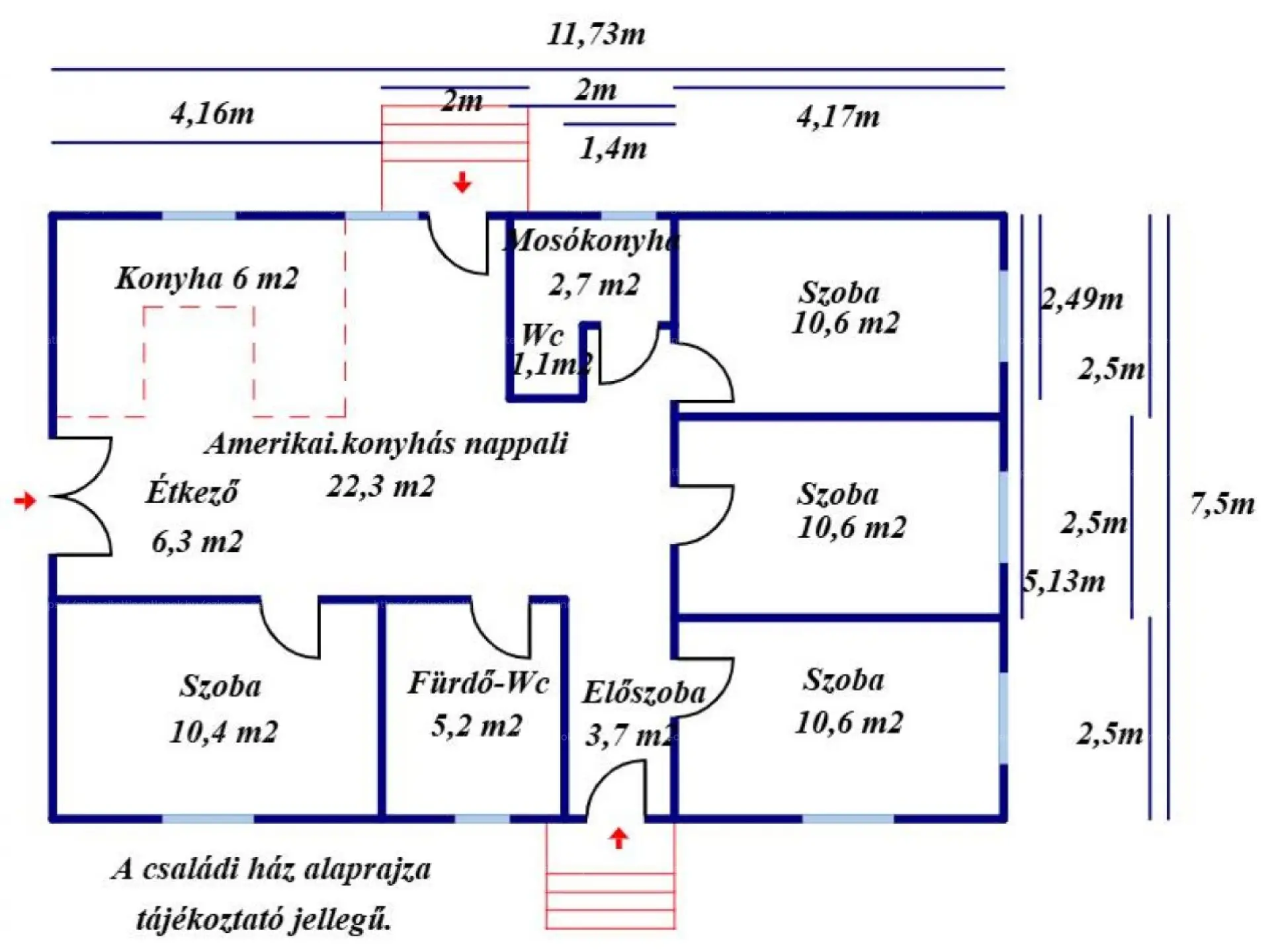ELRENDEZÉS: 4 külön hálószoba + amerikai konyhás nappali étkezővel, előszoba, közlekedő, fürdő WC-vel, külön WC, mosókonyha.