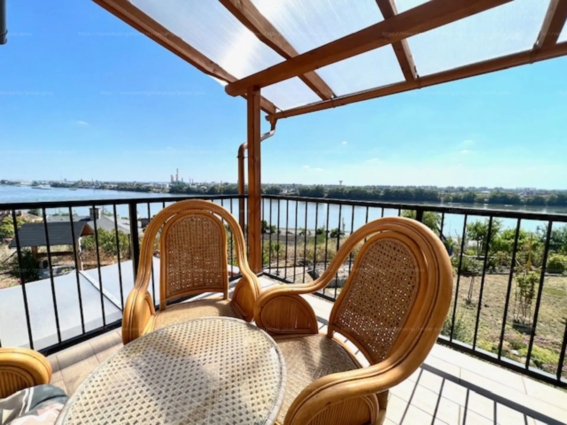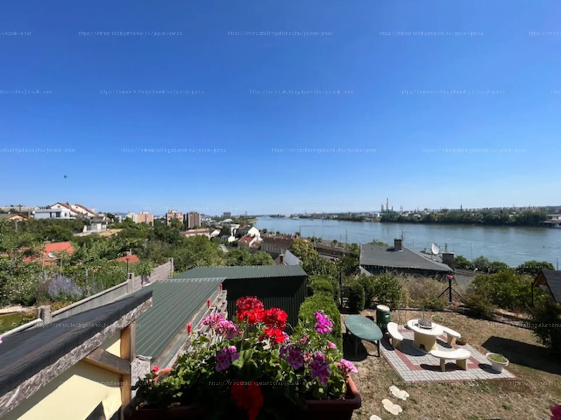 A ház különlegessége, hogy a kertből s a házból is panorámás kilátás van a Dunára, s csak a 2 garázsnál van közös fal a szomszéddal. Az udvar rész külön lekerített, saját használatú.