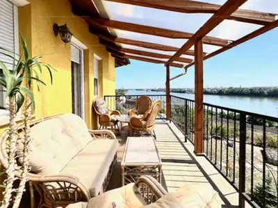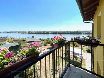 A ház különlegessége, hogy a kertből s a házból is panorámás kilátás van a Dunára, s csak a 2 garázsnál van közös fal a szomszéddal. Az udvar rész külön lekerített, saját használatú.