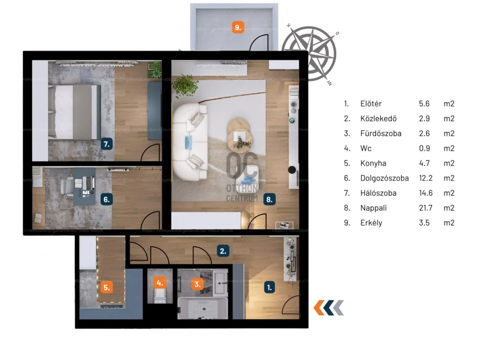 ✅ Jó elosztás: erkélyes nappali, háló, dolgozó, ablakos konyha