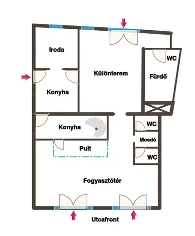 Tágas vendégtérrel és egy szeparált különteremmel is rendelkezik, amit lakásként is lehet használni. Konyhával, pult, iroda, vendégmosdók, galérián tárolók, mosdókkal és személyzeti öltözőkkel rendelkezik