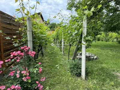 A tágas kinti terület és a kert szépen rendben tartott , szőlőlugasokkal és gyümölcsfákkal.