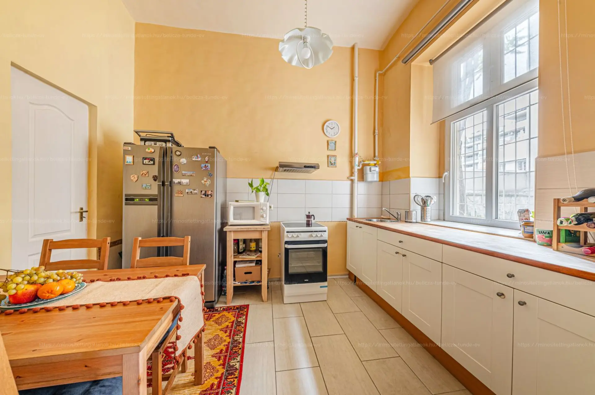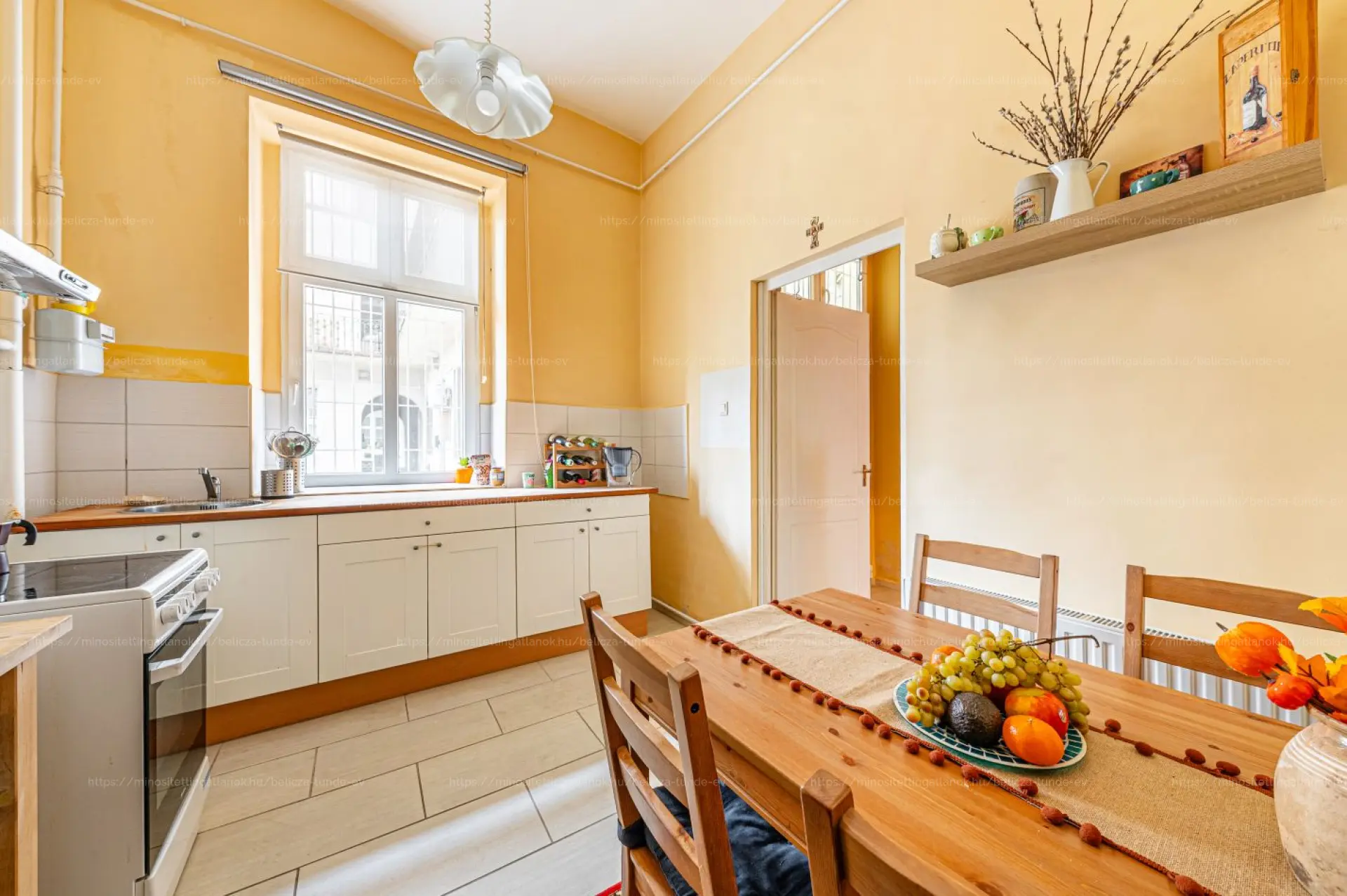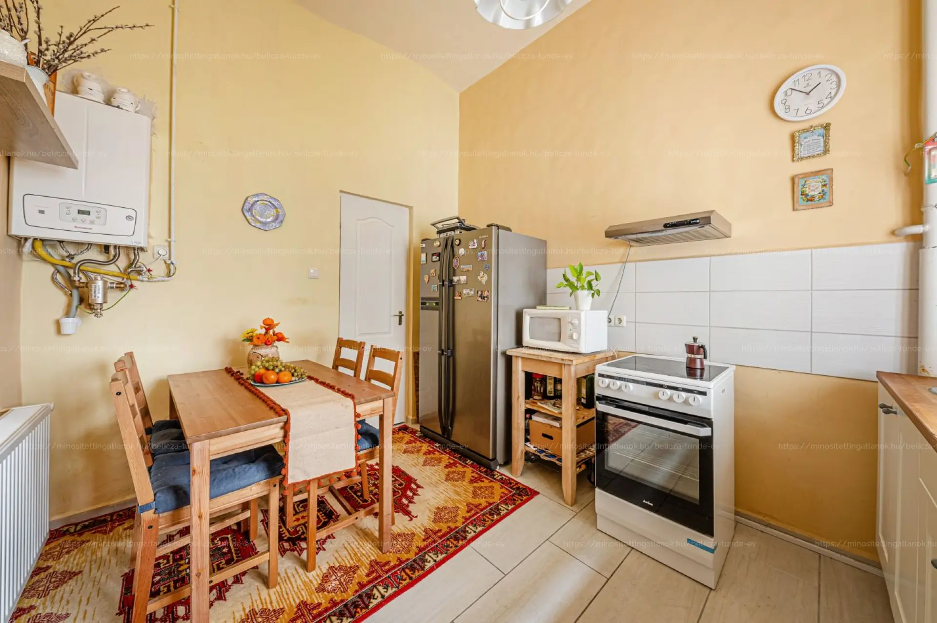 A konyha tágas, étkezős kialakítású, ablaka a csendes belső udvarra néz. A fürdőszoba és a WC külön helyiségben található. A lakás földszinti, így könnyen megközelíthető, idősek számára is praktikus elrendezésű.