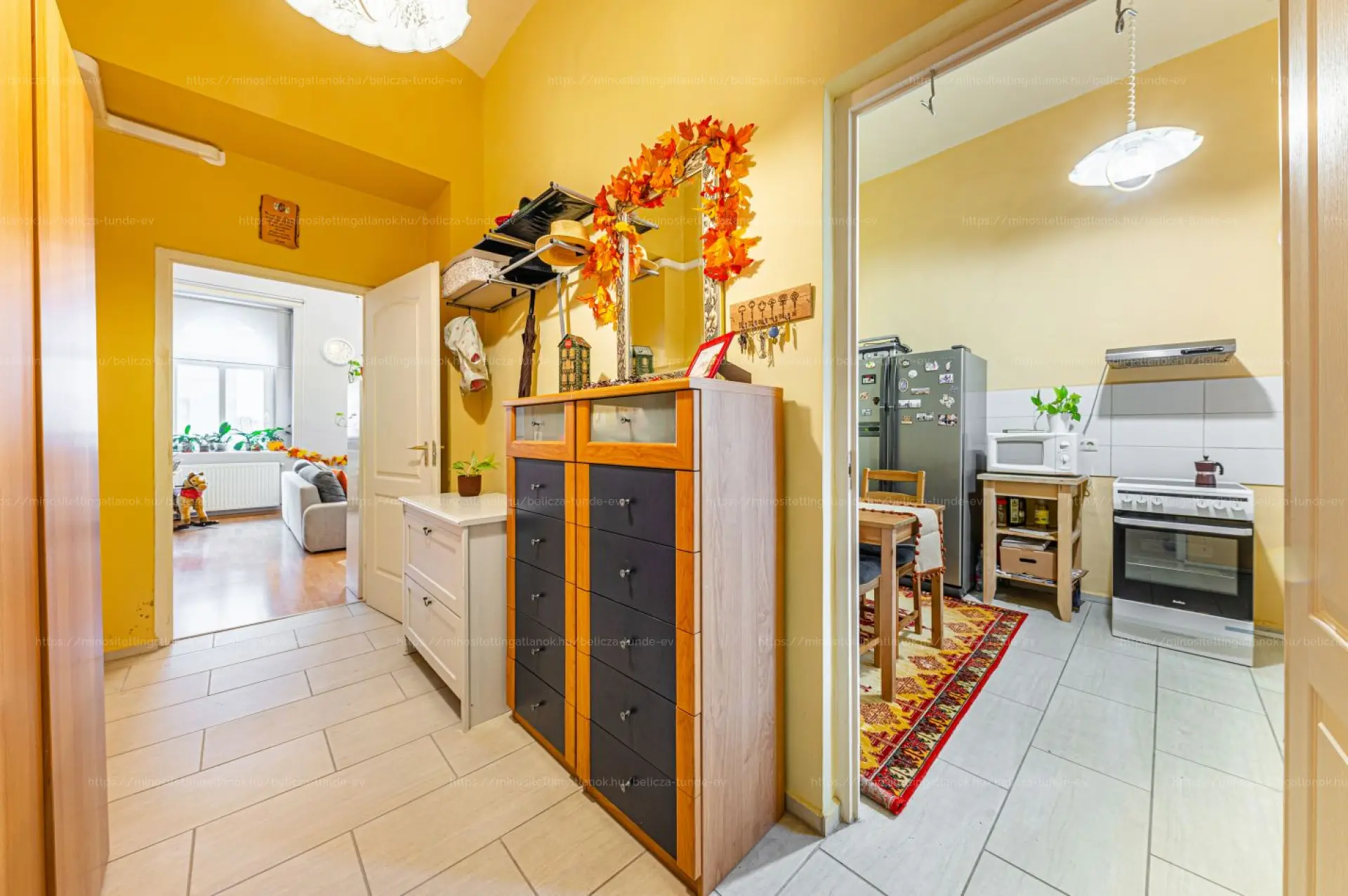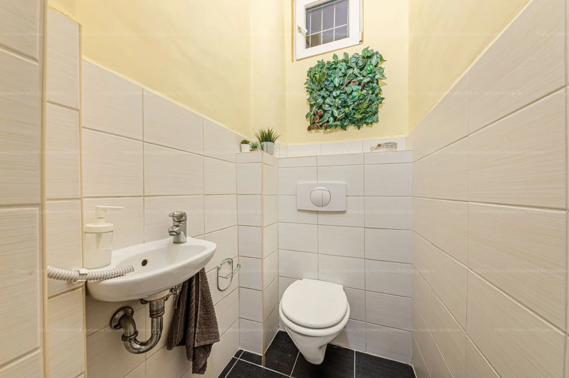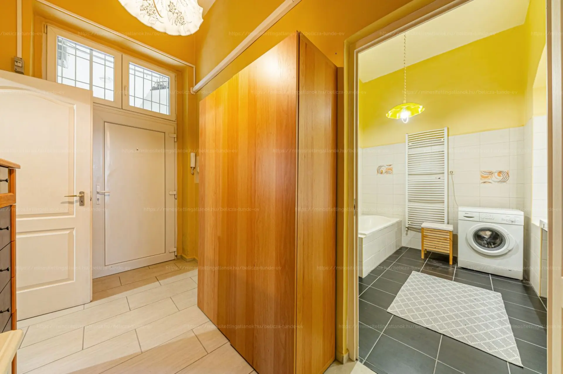 A konyha tágas, étkezős kialakítású, ablaka a csendes belső udvarra néz. A fürdőszoba és a WC külön helyiségben található. A lakás földszinti, így könnyen megközelíthető, idősek számára is praktikus elrendezésű.
