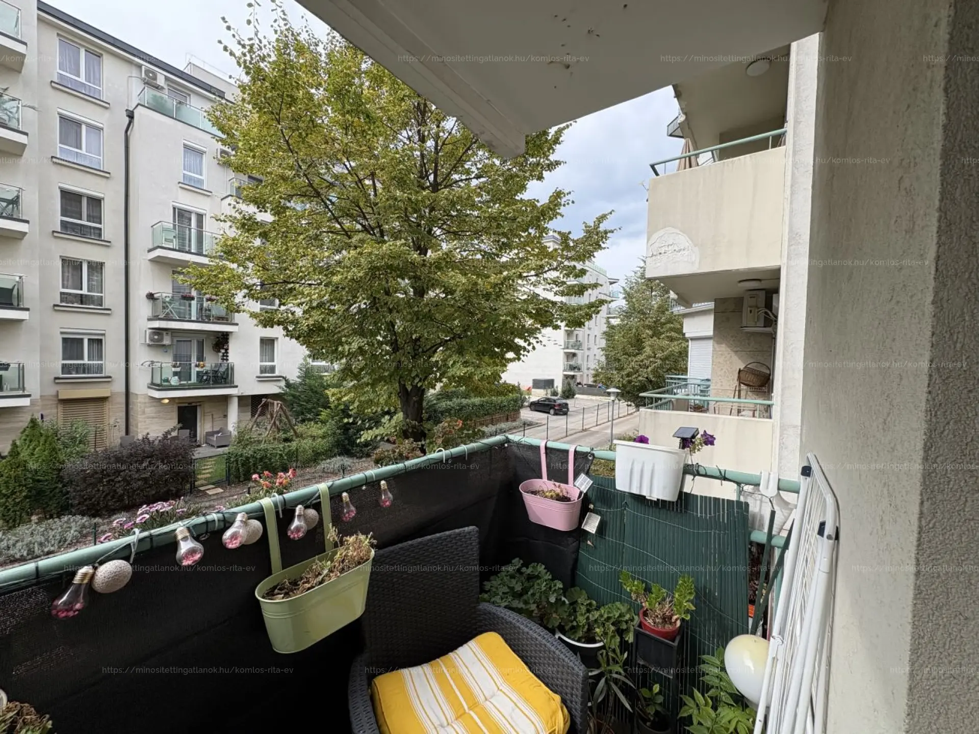 A dél-délnyugati fekvésű, világos otthon belső, gondozott kertre néz, így csendes és nyugodt környezetet biztosít lakóinak. A nappaliból és az egyik hálóból erkély nyílik, ahonnan kellemes a kilátás a rendezett kertre, udvarra.