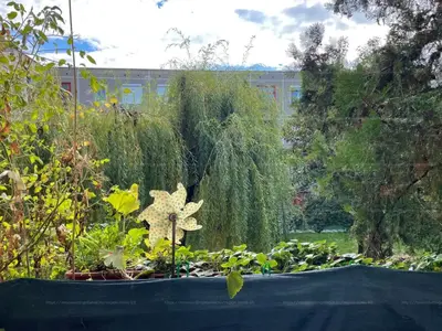 A 3 m²-es erkély tökéletes hely a reggeli kávé élvezetére, csodálva a nyugodt, zöld környezetet.