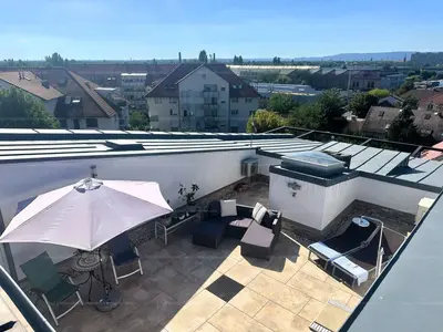 A valódi különlegességet azonban a 53 m²-es, fantasztikus tetőterasz jelenti, ahonnan lélegzetelállító panoráma nyílik a környékre. A teraszon hideg–meleg vizes zuhanyzó került kialakításra, így a nyári napokon akár saját napozóteraszként vagy kültéri wellnessként is funkcionálhat. Két külön bejáratú, egyenként 9 m²-es saját tároló is közvetlenül innen nyílik, ami tovább növeli a praktikumot.