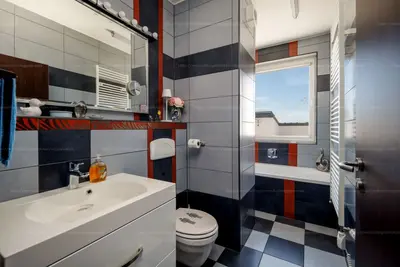 A lakásban két különálló fürdőszoba is helyet kapott – az egyik zuhanyzós, a másik pedig kádas kialakítású –, ami nagy előny többgyermekes családok vagy vendégek esetén. A modern életvitelhez igazodva műanyag nyílászárók és redőnyök biztosítják a komfortot és az energiahatékonyságot.