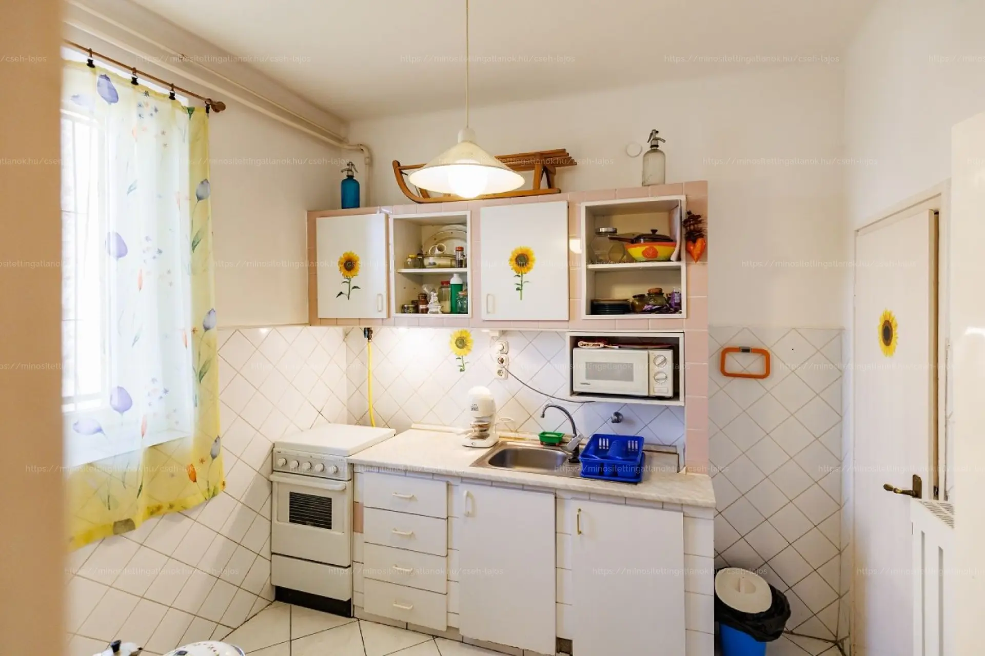 Az előszobából nyílik a tágas, ablakos konyha, mely kis kamrával is rendelkezik.