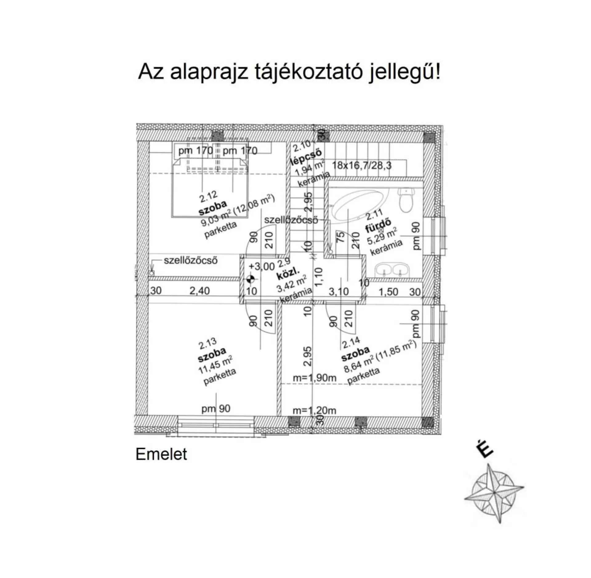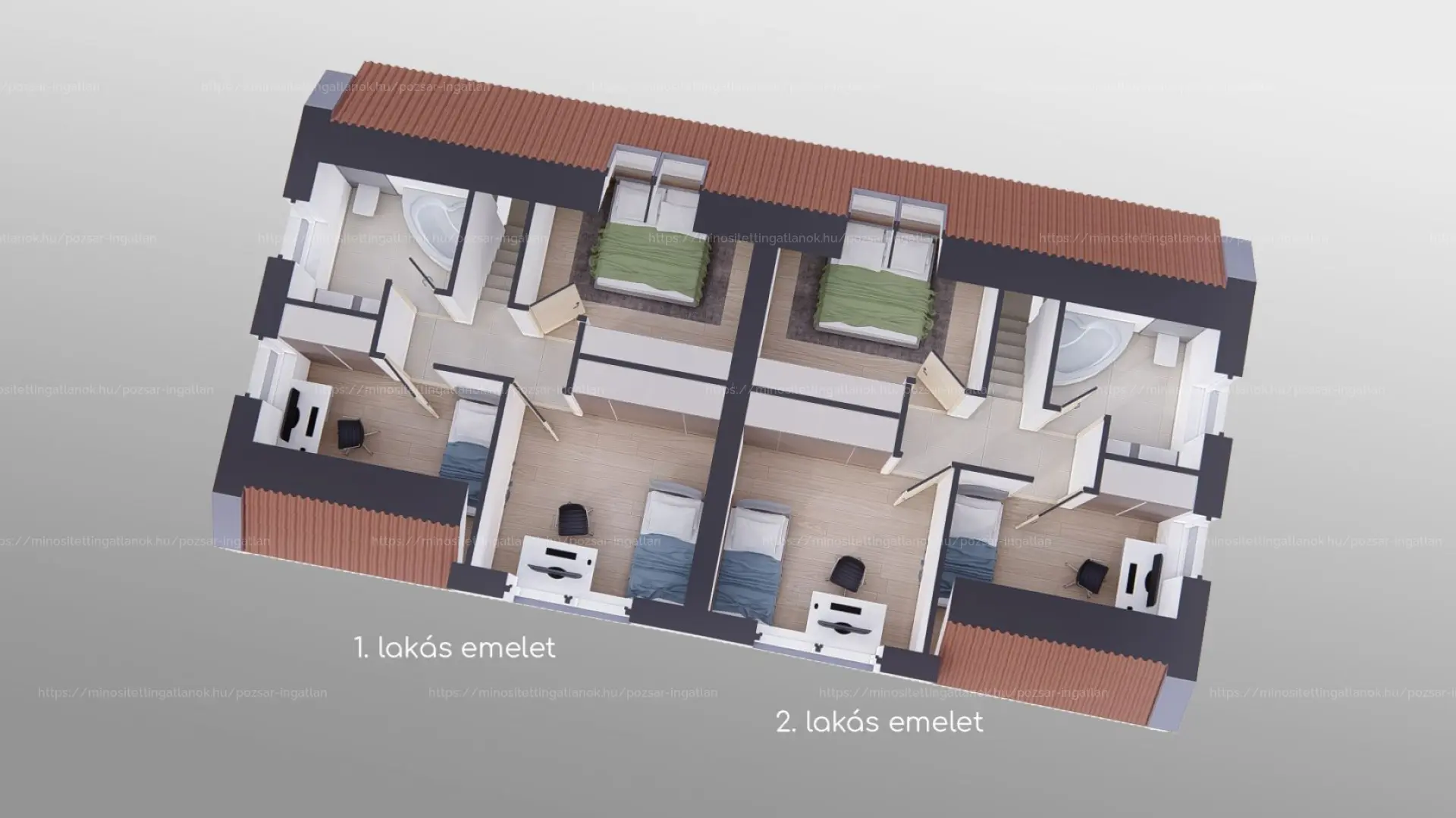 A tetőtérben három hálószoba, valamint egy tágas FÜRDŐSZOBA van. A helyiségek elosztása jól átgondolt, CSALÁDOK számára kényelmes mindennapi használatot biztosít.