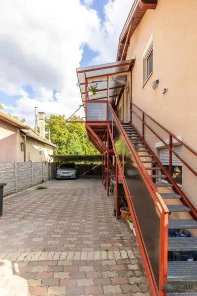 Az emelet külső lépcsőn közelíthető meg egy 12 m2-es fedett teraszon át.