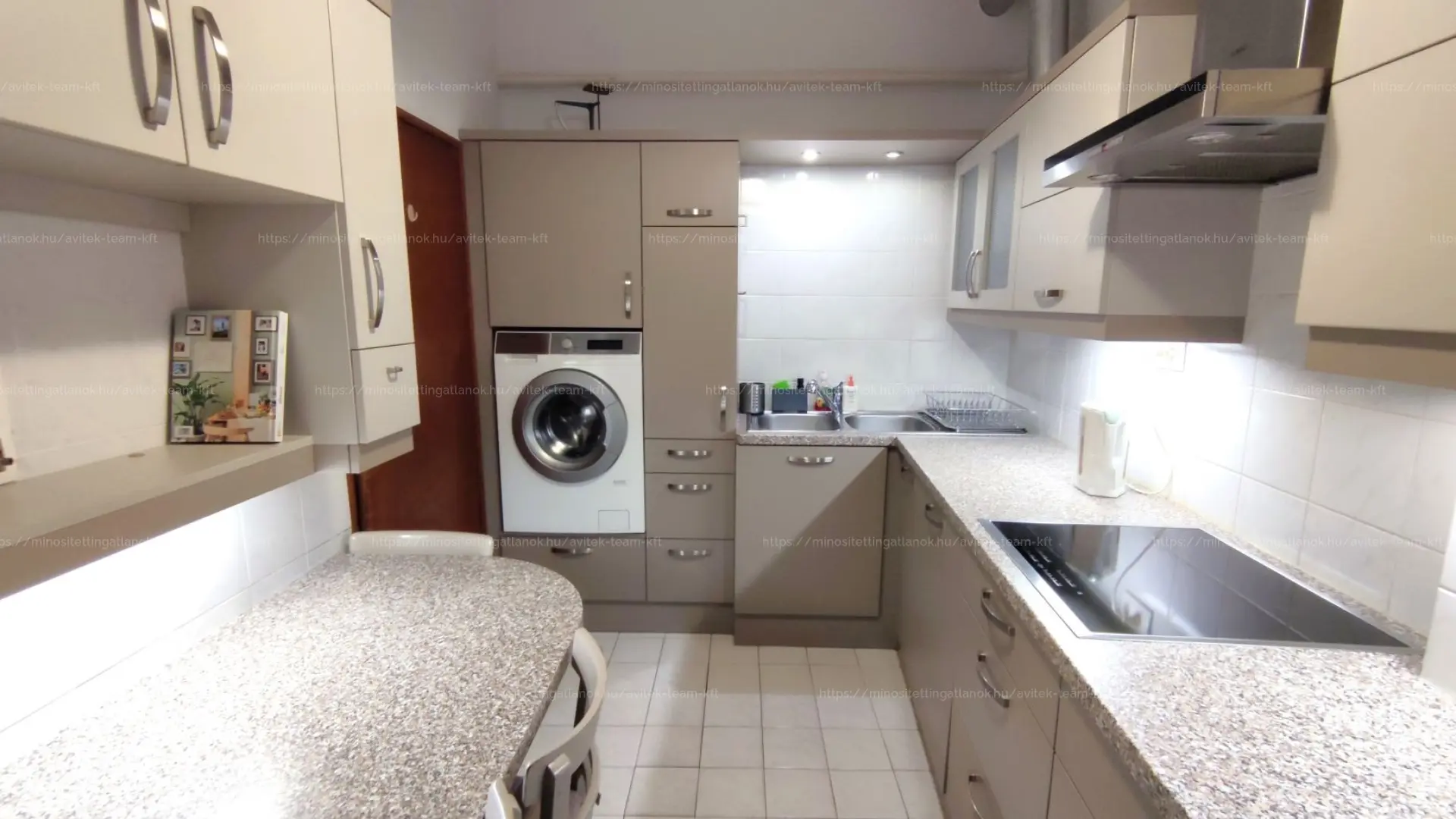 A konyha ablakos, elektromos tűzhellyel, sütővel, elszívóval, hűtővel, mikróval, étkezőasztallal felszerelt, mosógép is itt kapott helyet. Kamra tartozik hozzá.