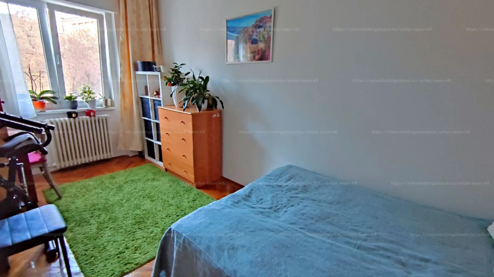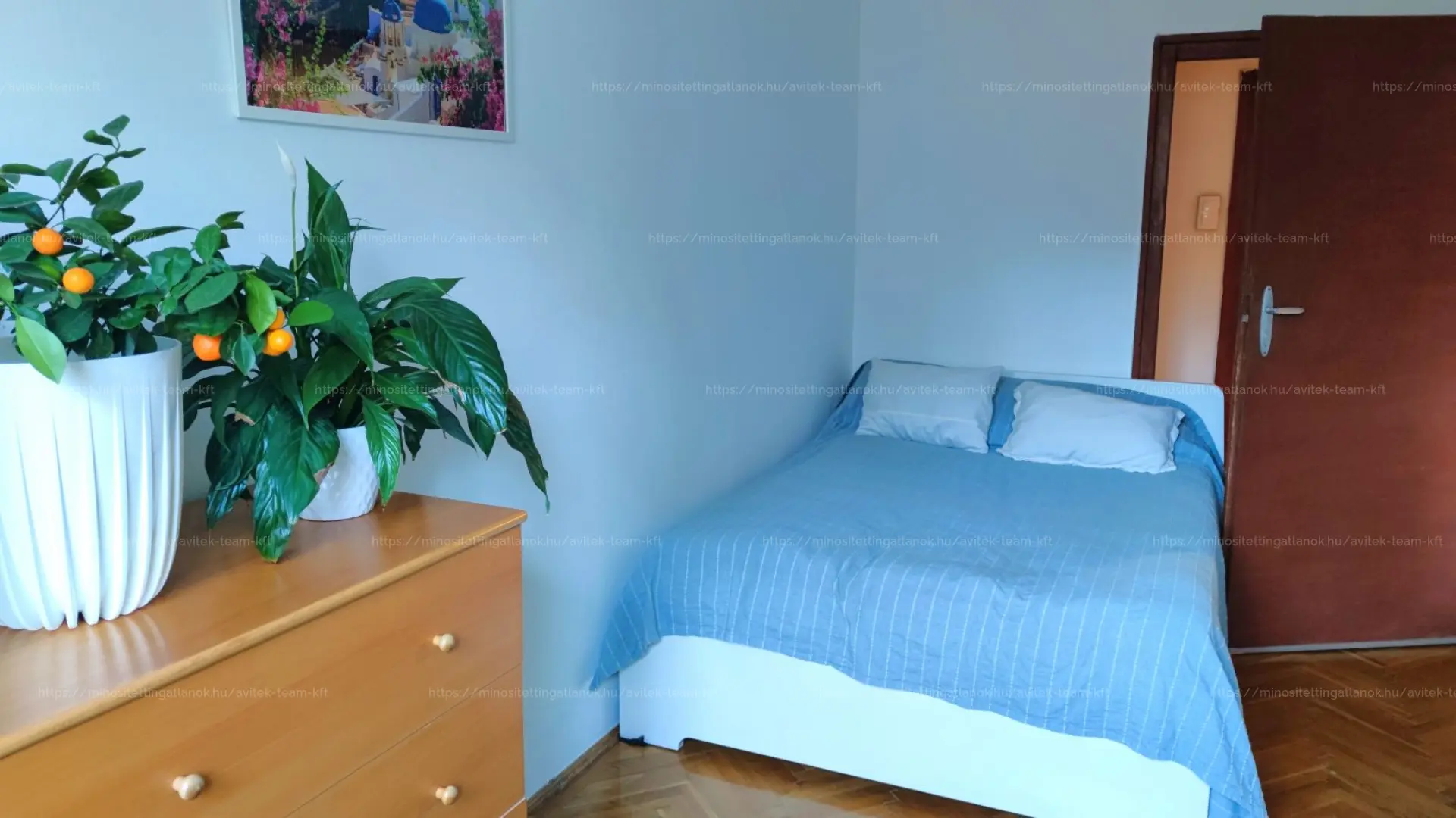 A hálószoba a nappaliból és a közlekedőből is megközelíthető, az ott látható franciaágyat a jelenlegi bérlő elviszi. Igény esetén helyette 2 db egyszemélyes ágy használható.
