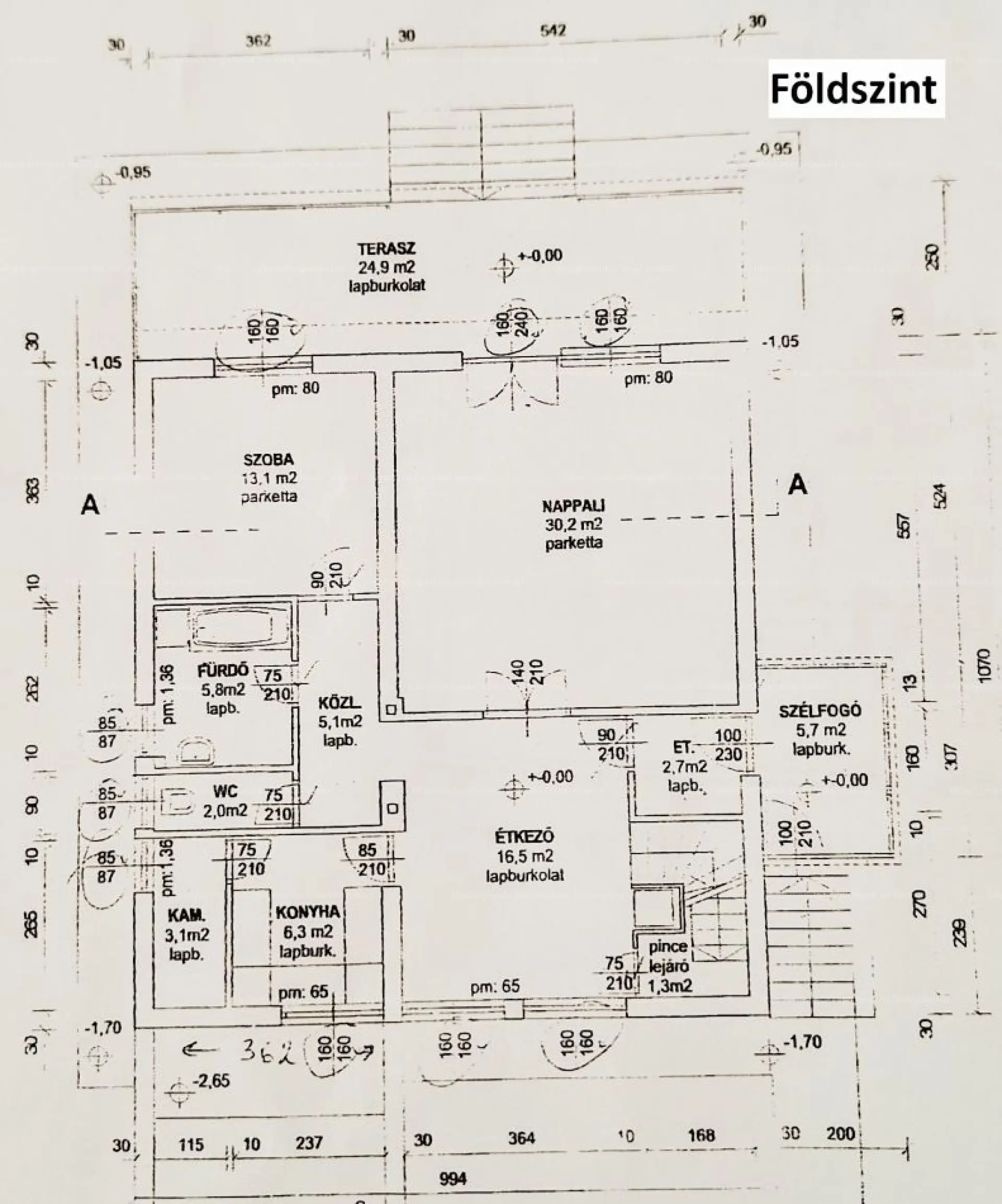 Földszint 91,8 m2 és 24,9 m2 terasz: tágas nappali kertkapcsolattal, teljes konyha, étkező, háló, fürdőszoba és külön WC.