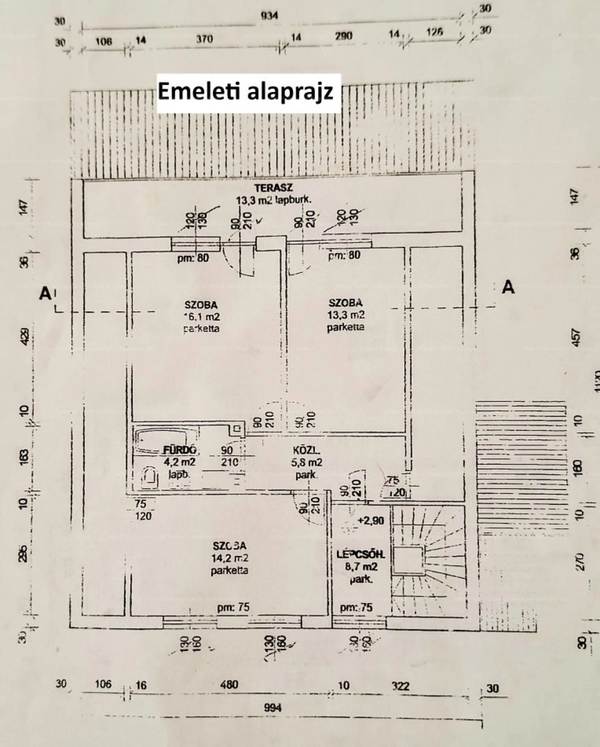 Felső szint (62,3 m² plusz 13,3 m² terasz): három hálószoba, ebből kettő teraszos, valamint fürdőszoba.