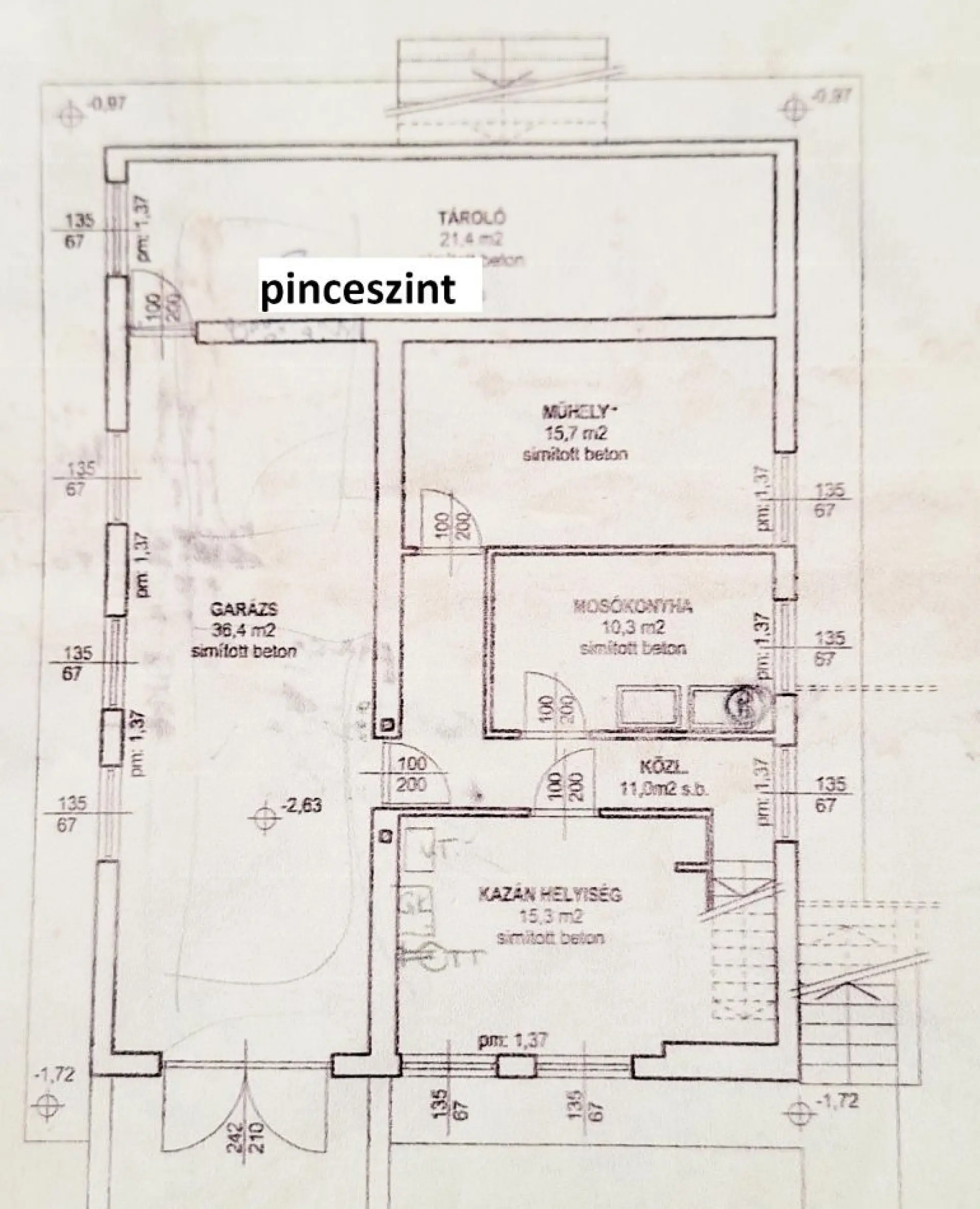 Pinceszint 110 m2 alapterülettel, benne kétállásos garázs és több tárolóhelyiség.
