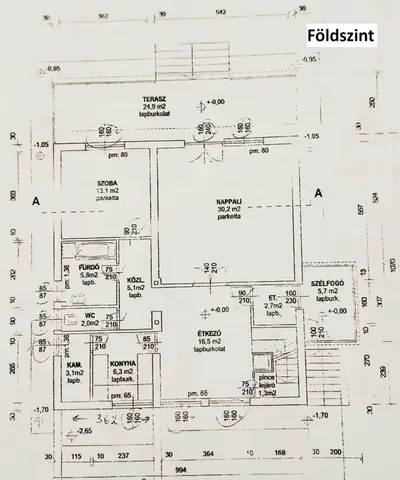 Földszint 91,8 m2 és 24,9 m2 terasz: tágas nappali kertkapcsolattal, teljes konyha, étkező, háló, fürdőszoba és külön WC.