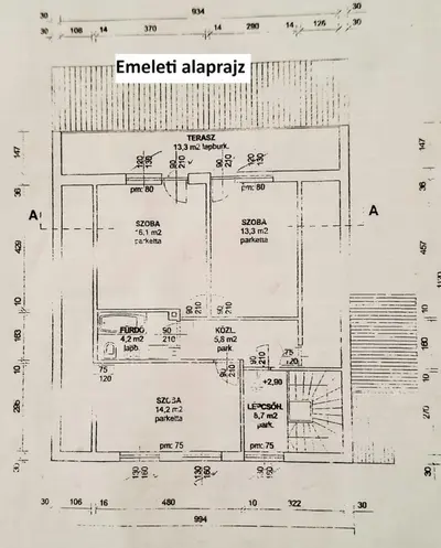 Felső szint (62,3 m² plusz 13,3 m² terasz): három hálószoba, ebből kettő teraszos, valamint fürdőszoba.