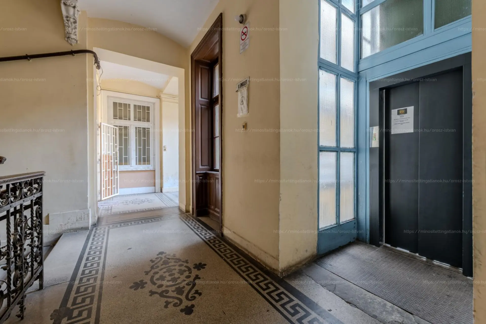 Második emeleti elhelyezkedés liftes polgári házban a ház belső és külső része rendezett
